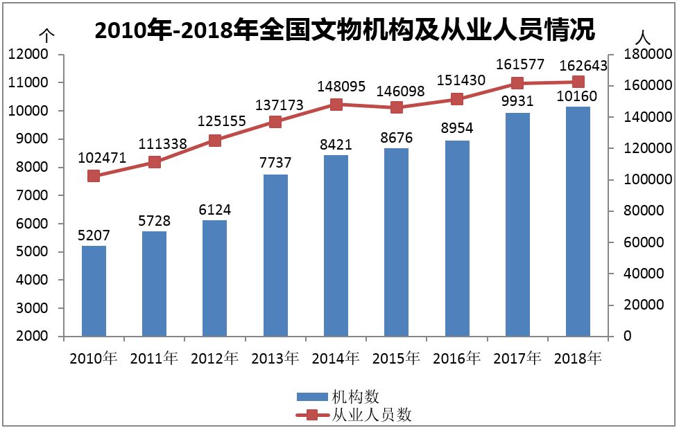 年末全国共有各类文物机构10160个,比上年末增加229个。其中,文物保护管理机构3550个,占34.9%;博物馆4918个,占48.4%。年末全国文物机构从业人员16.26万人,比上年末增加0.11万人。其中高级职称9682人,占6.0%,中级职称20679人,占12.7%。