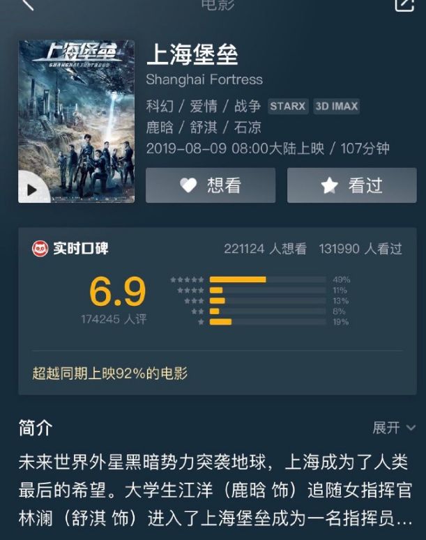 可是电影上映后,却没有达到预期的效果,相反《上海堡垒》上映两天后票房仅仅才8000多万,这跟预期的效果差距也非常之大,不仅如此,这部电影的评分也是一直急降,甚至在猫眼的评分也跌至到了6.9,而且这次平台预估的票房仅为两亿左右。