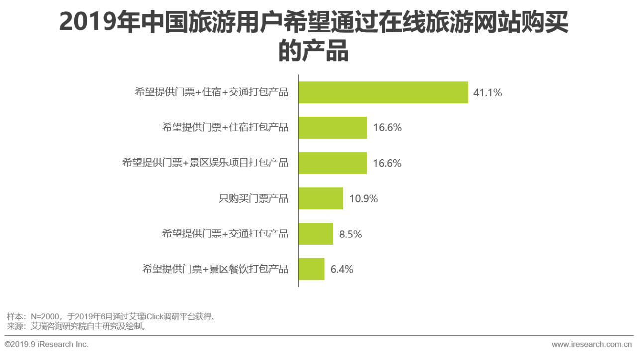 在对景区旅游产品的购买偏好的调查方面,希望在在线旅游网站购买“门票+住宿+交通”一站式打包产品的用户占比最高,达41.1%,相较于其他产品组合来说,“门票+住宿+交通”一站式打包产品不仅可节省游客预订景区各类型产品的时间和精力,价格也更加优惠,因此,一站式打包旅游产品受到众多游客的喜爱。
