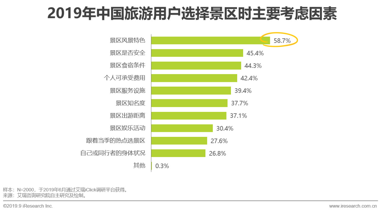 艾瑞调研结果显示,景区风景特色是用户在选择景区时最为看重的因素,此外,景区的安全性、食宿条件以及费用等因素也是用户较为看重的因素。在景区类型选择方面,湖光山色、海滨岛屿等自然景观类景区更受到用户的欢迎,民族/古镇风情、历史遗迹等人文景观也是用户较为偏爱的景区类型;也有超四成的用户选择主题公园/游乐园类景区。