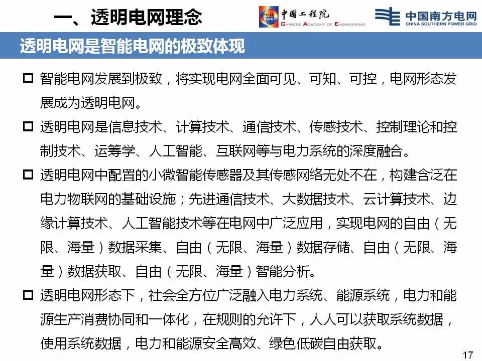 近期,中国工程院院士、南方电网公司专家委员会主任委员李立浧首次提出“透明电网”概念:把现代信息技术与电网相结合,在电网上安装小微智能传感器,让电力系统的各个环节展示出来,包括电源信息透明、网络信息透明、市场信息透明、设备状态透明、运行状态透明、交易状态透明等等,形成“透明电网”。它可以让社会各方广泛深入参与电力生产、传输、消费等各个环节,协同促进能源电力的安全高效、绿色低碳发展。