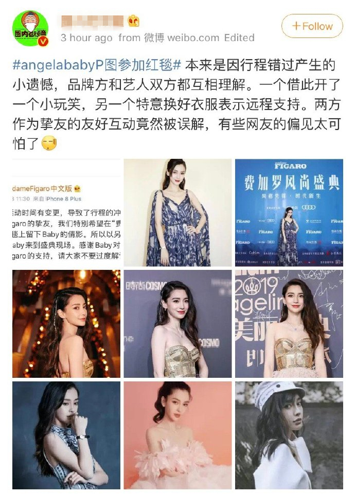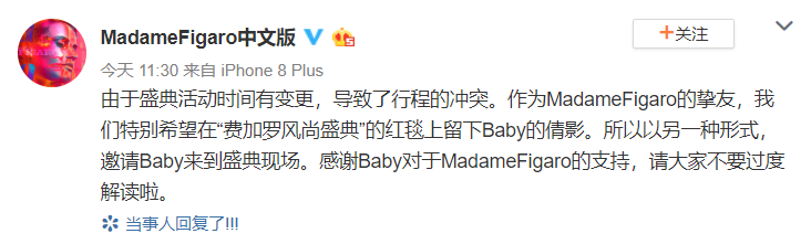 而在这时,为了及时止损,杂志官方也在不久后回应并辟谣此事,表示此举是两方都愿意的事,是官方“希望在活动的红毯上留下Baby的倩影。所以以另一种形式,邀请Baby来到盛典现场。”最后,杂志方也希望大家不要过度解读。