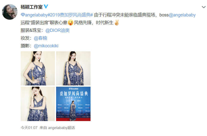 12月8日凌晨,Angelababy工作室晒出一组baby照片,并配文:“由于行程冲突未能亲临盛典现场,boss远程“盛装出席”聊表心意风格先锋,时代新生“