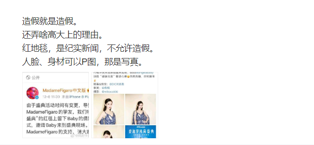 首先,不管P图行为是由哪方产生的想法,但工作室既然让杨颖妆发齐整拍了照发给主办方用于配合这个宣传,就已经侧面同意了抠图红毯的行为。