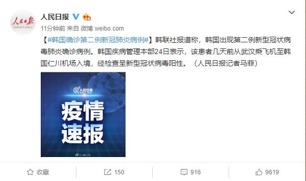 韩联社报道称,韩国出现第二例新型冠状病毒肺炎确诊病例。韩国疾病管理本部24日表示,该患者几天前从武汉乘飞机至韩国仁川机场入境,经检查呈新型冠状病毒阳性。