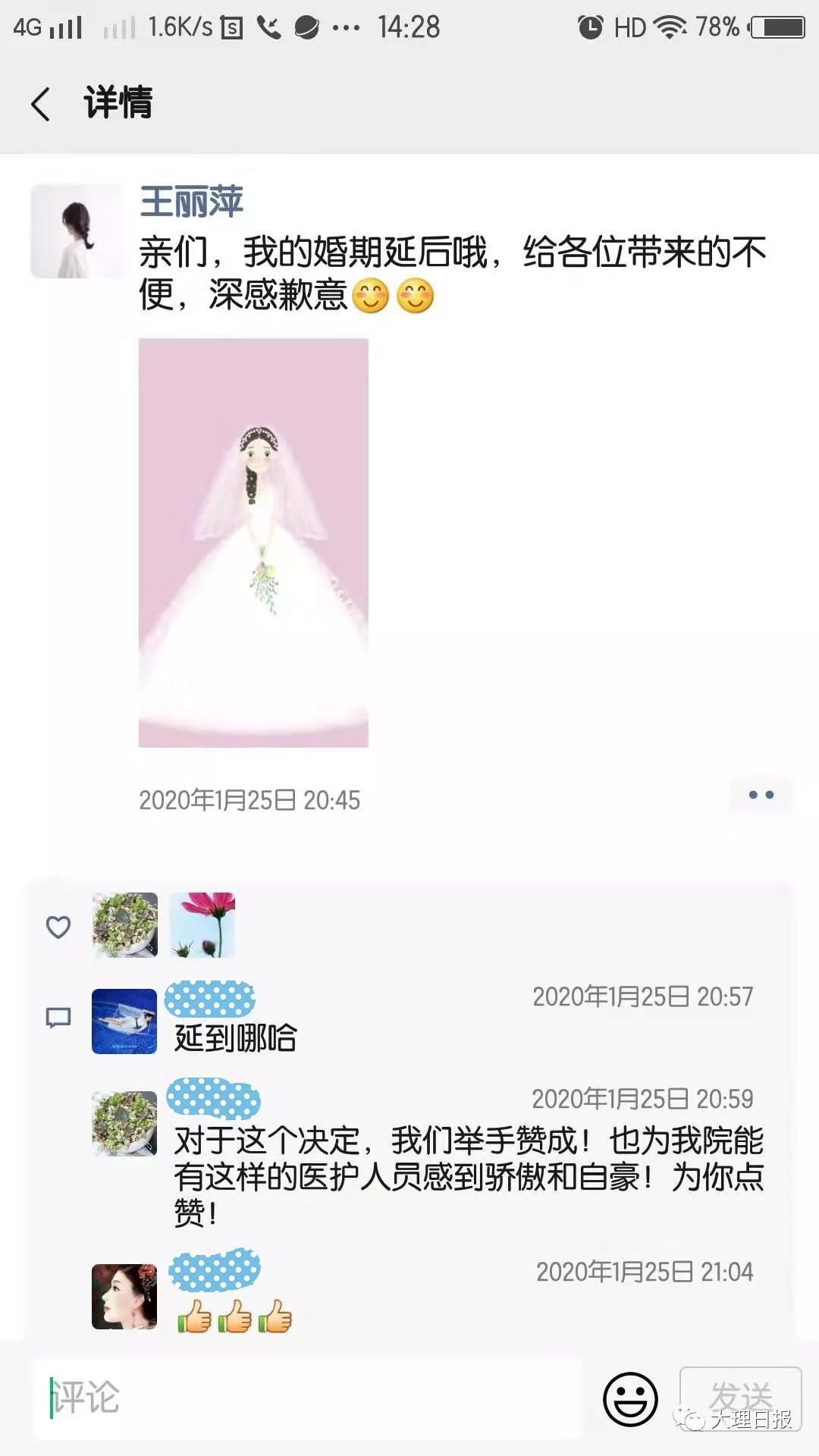 祥云县人民医院心内科的刘洋,原定于大年初七穿上婚纱,她也取消了婚礼,坚守在临床一线岗位。刘洋说:“准备很久的婚礼,取消了有些遗憾,但在这样的节骨眼上,我又是一名医务工作者,此时此刻,就是要和同事们并肩战斗,早日打赢这场战役。”