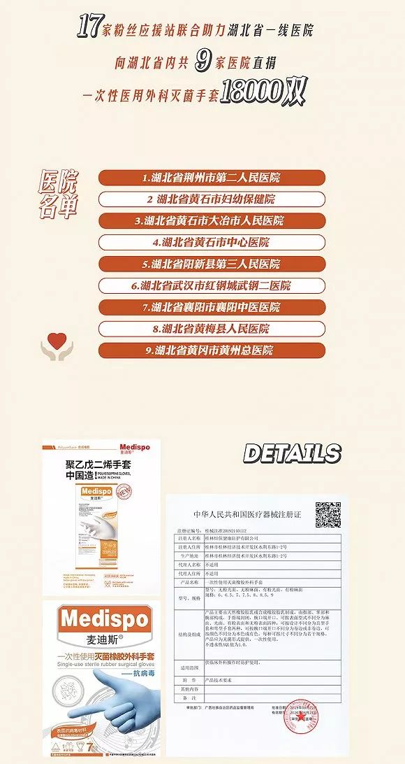 第一批1.2万双一次性医用灭菌外科手套是刘宪华小C应援站的粥粥找到的。找到资源的那天正值除夕,我们扫完了厂商的所有可供现货,并在当天发出,隔天就到达了武汉的医院。之后我们又在网络上找到了1000份面罩。第二批手套的货源来自于韩娱站子JSHINE李钟硕。现在我们即将从海外运回的8200套防护服来自于肖战公益站小爱的朋友。