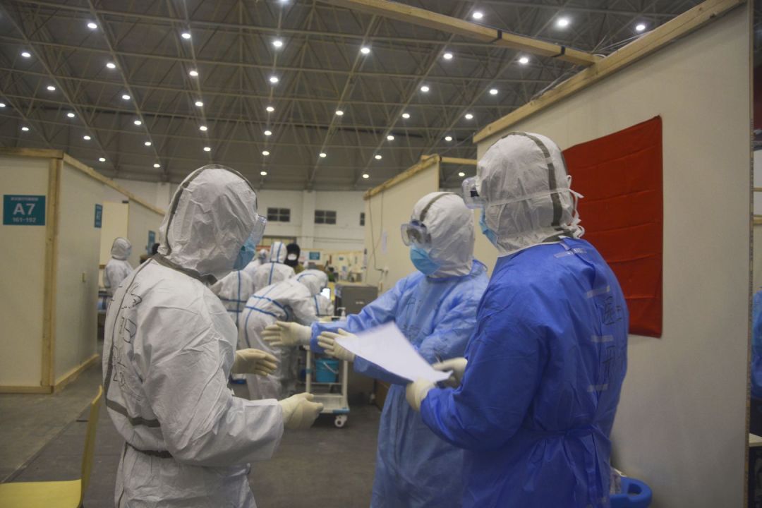 (首批进驻东西湖方舱医院的医护人员来自中日友好医院紧急医学救援队、武汉大学中南医院、四川紧急医学救援队、福建紧急医学救援队等。他们正在碰头确认各项流程)