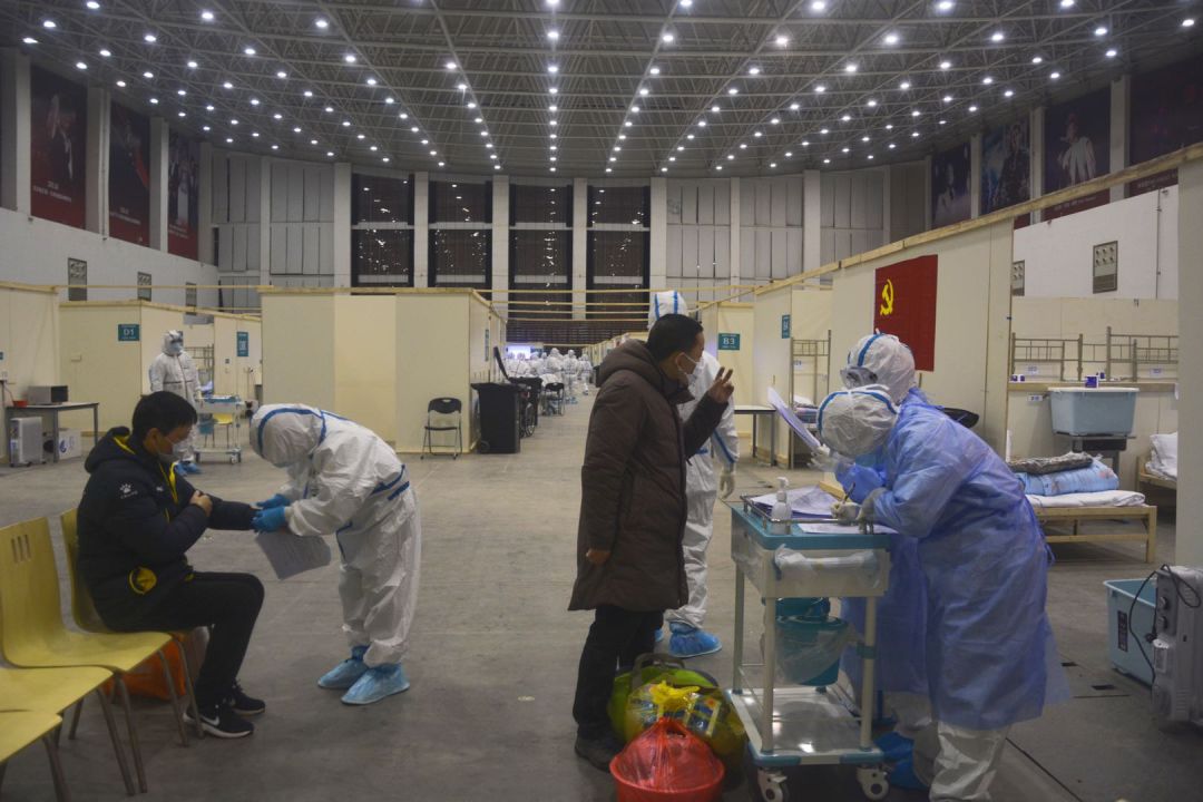 (中日友好医院的两位医生正在接诊首位进入方舱医院的患者。护士正在为下一位患者监测体征。由于方舱医院主要收治轻症患者,大多数患者行动比较自如。)