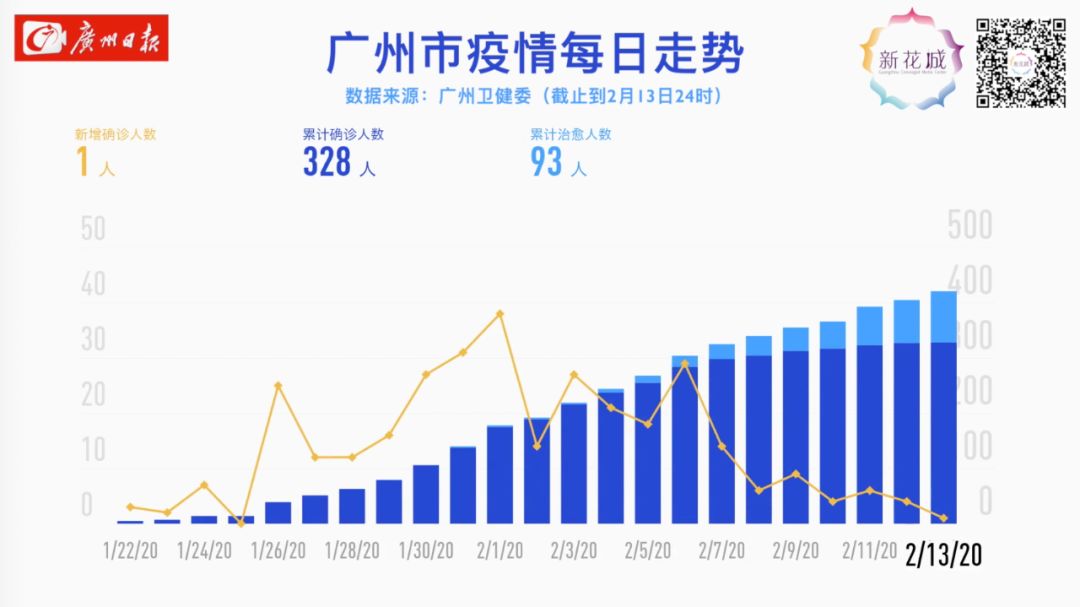 2020年2月13日0时至24时,广州市报告新冠肺炎新增确诊病例1例(海珠区1例)。新增治愈出院15例。