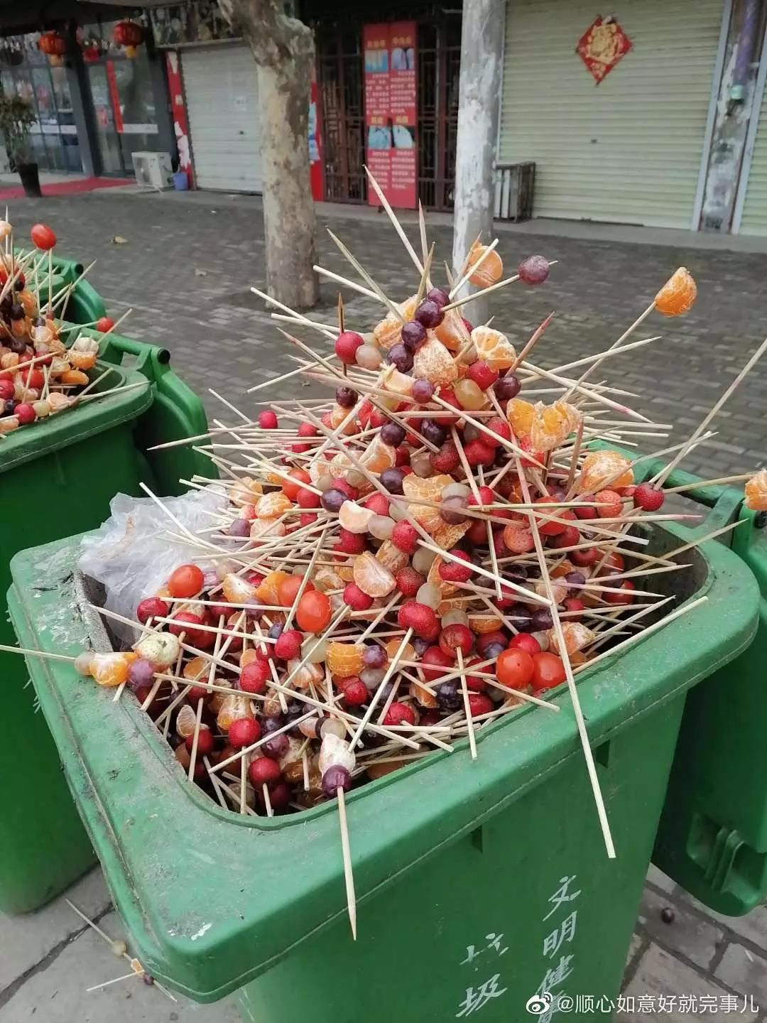 空无一人的街道上,串好了的糖葫芦,成堆地堆在垃圾箱里。