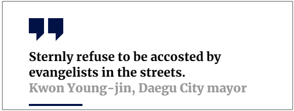 在这次大邱教堂的感染“事故”之后, 新天地教立即向全韩国的信众发布了通知,