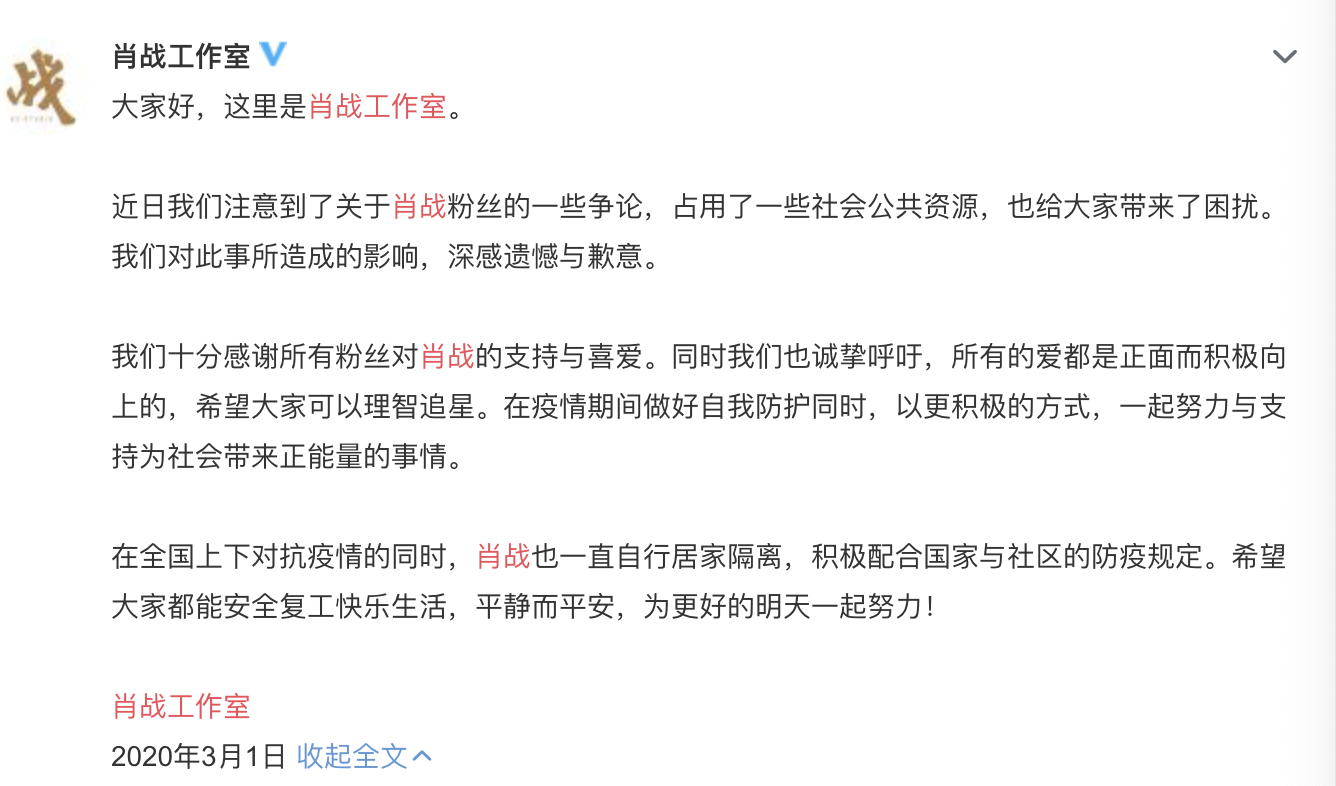 近日我们注意到了关于肖战粉丝的一些争论,占用了一些社会公共资源,也给大家带来了困扰。我们对此事所造成的影响,深感遗憾与歉意。