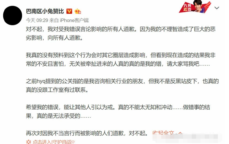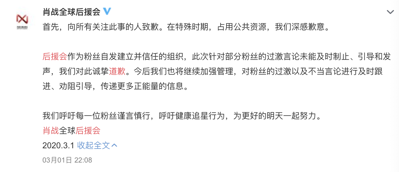 后援会作为粉丝自发建立并信任的组织,此次针对部分粉丝的过激言论未能及时制止、引导和发声,我们对此诚挚道歉。今后我们也将继续加强管理,对粉丝的过激以及不当言论进行及时跟进、劝阻引导,传递更多正能量的信息。