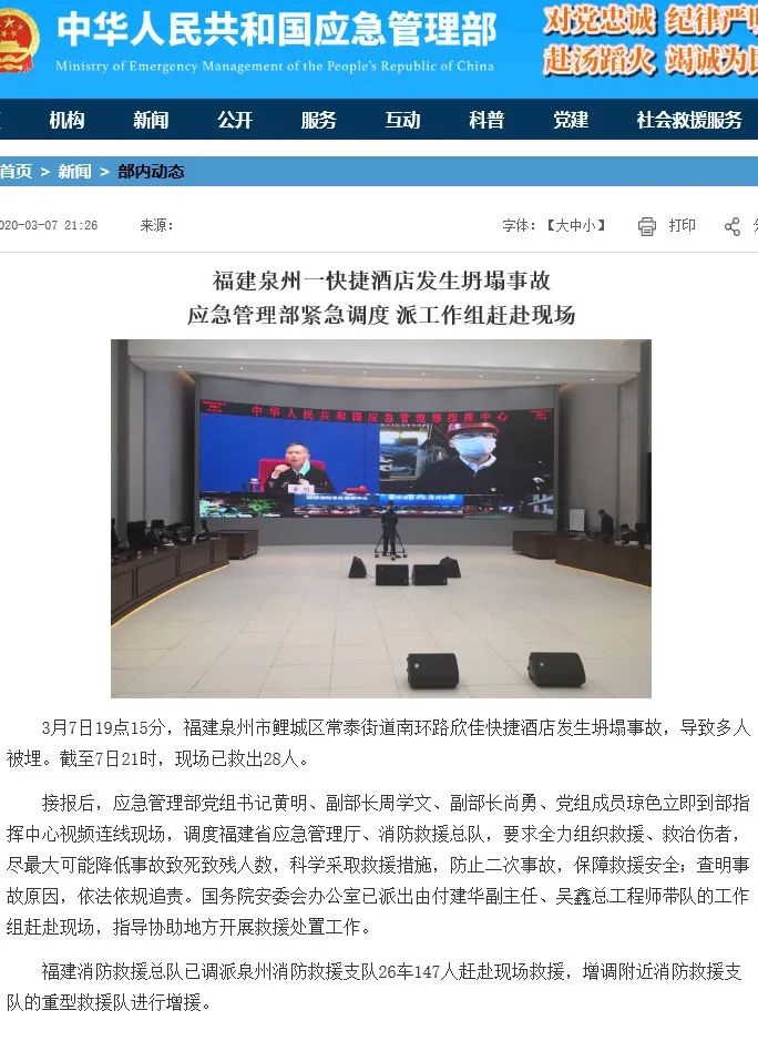 3月7日19点15分,福建泉州市鲤城区常泰街道南环路欣佳快捷酒店发生坍塌事故,导致多人被埋。截至7日21时,现场已救出28人。