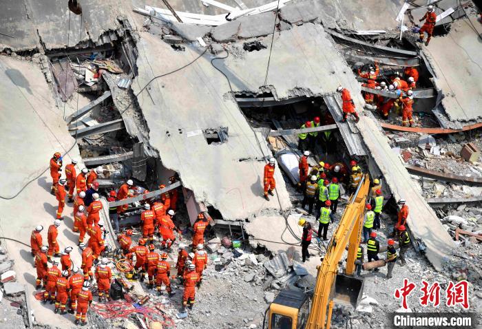 图为消防、建筑工人、吊装司机等众多人员在坍塌地现场争分夺秒搜寻被困人员。 张斌 摄