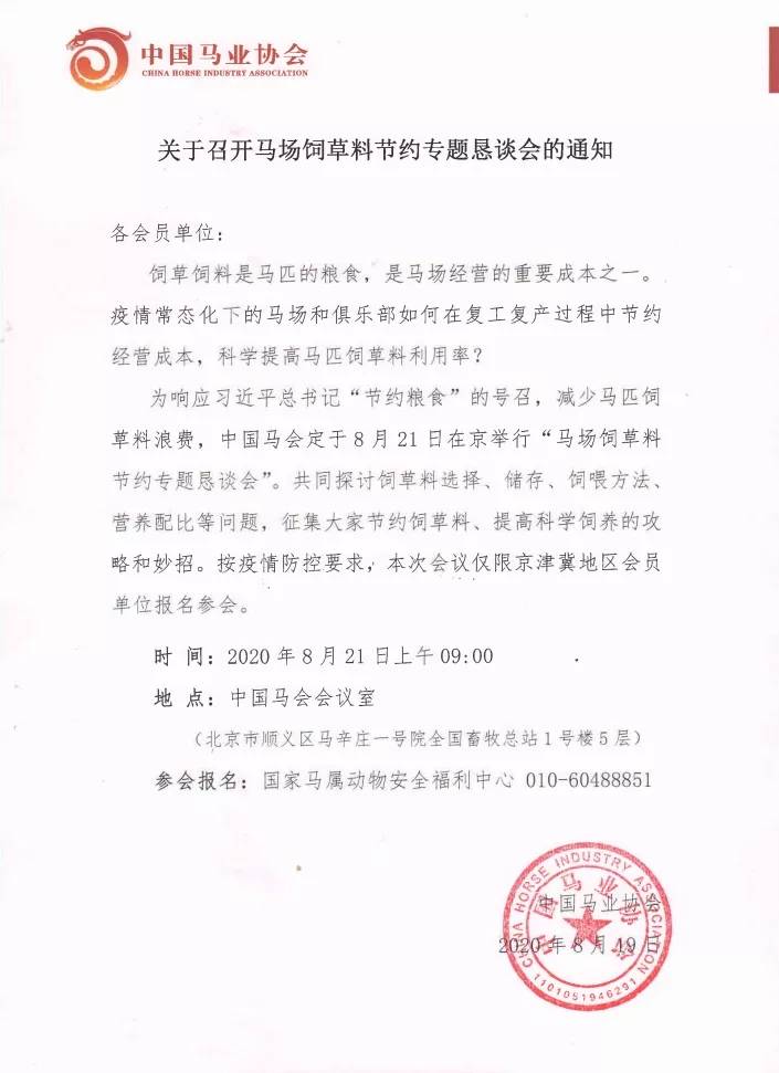 关于召开马场饲草料节约专题恳谈会的通知 来源:中国马业协会官方微信