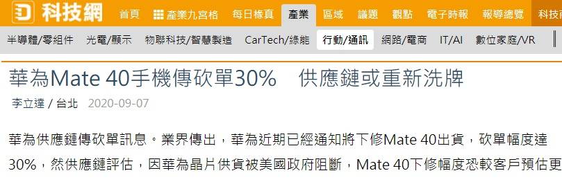 9月7日消息,台媒DigiTimes报道称,华为供应链传砍单讯息。业界传出,华为近期已经通知将下修Mate40出货,砍单幅度达30%。