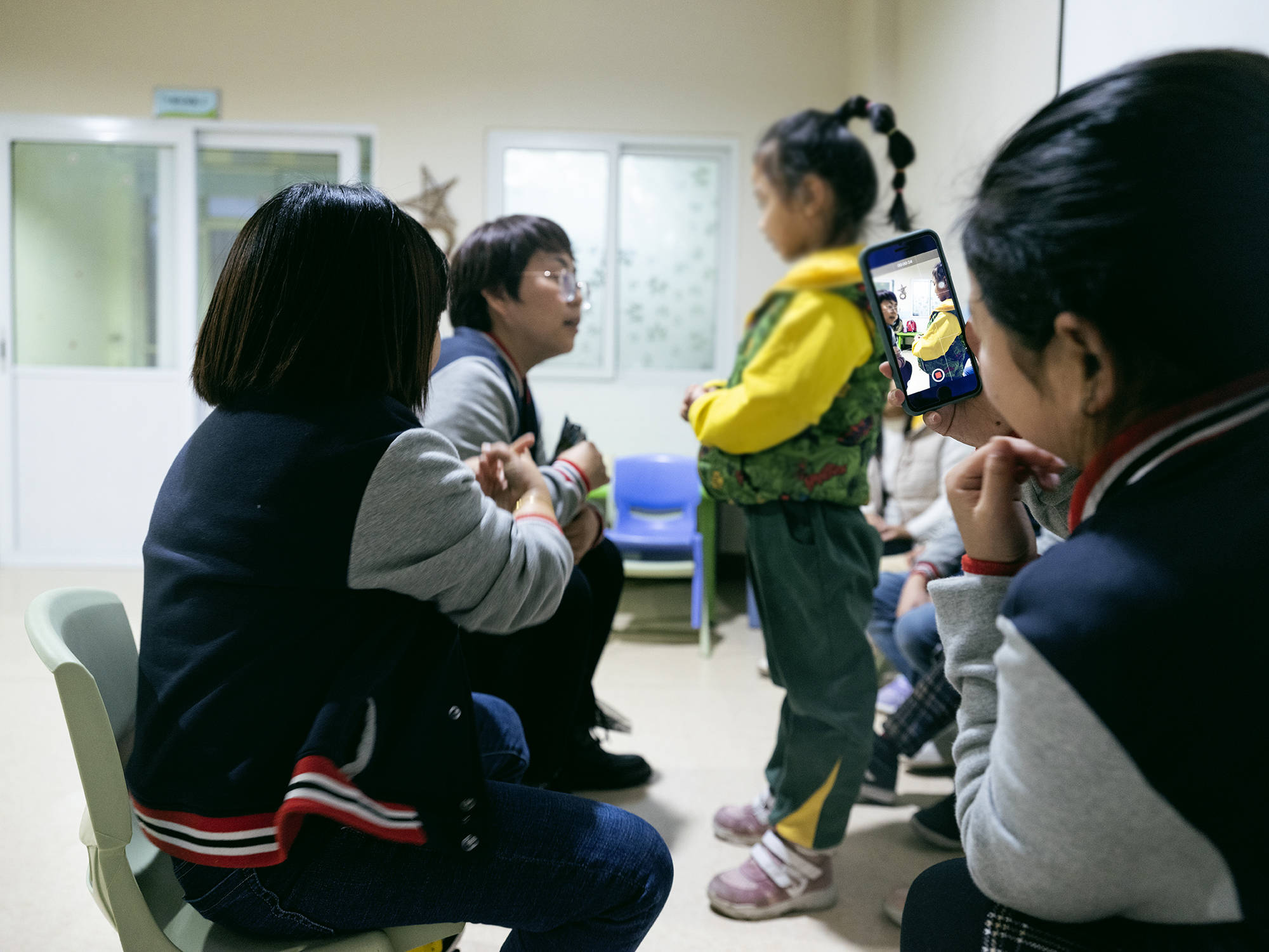 娜娜用手机录制着孩子在课堂上的表现,便于下课后和家长交流孩子当天的进步。