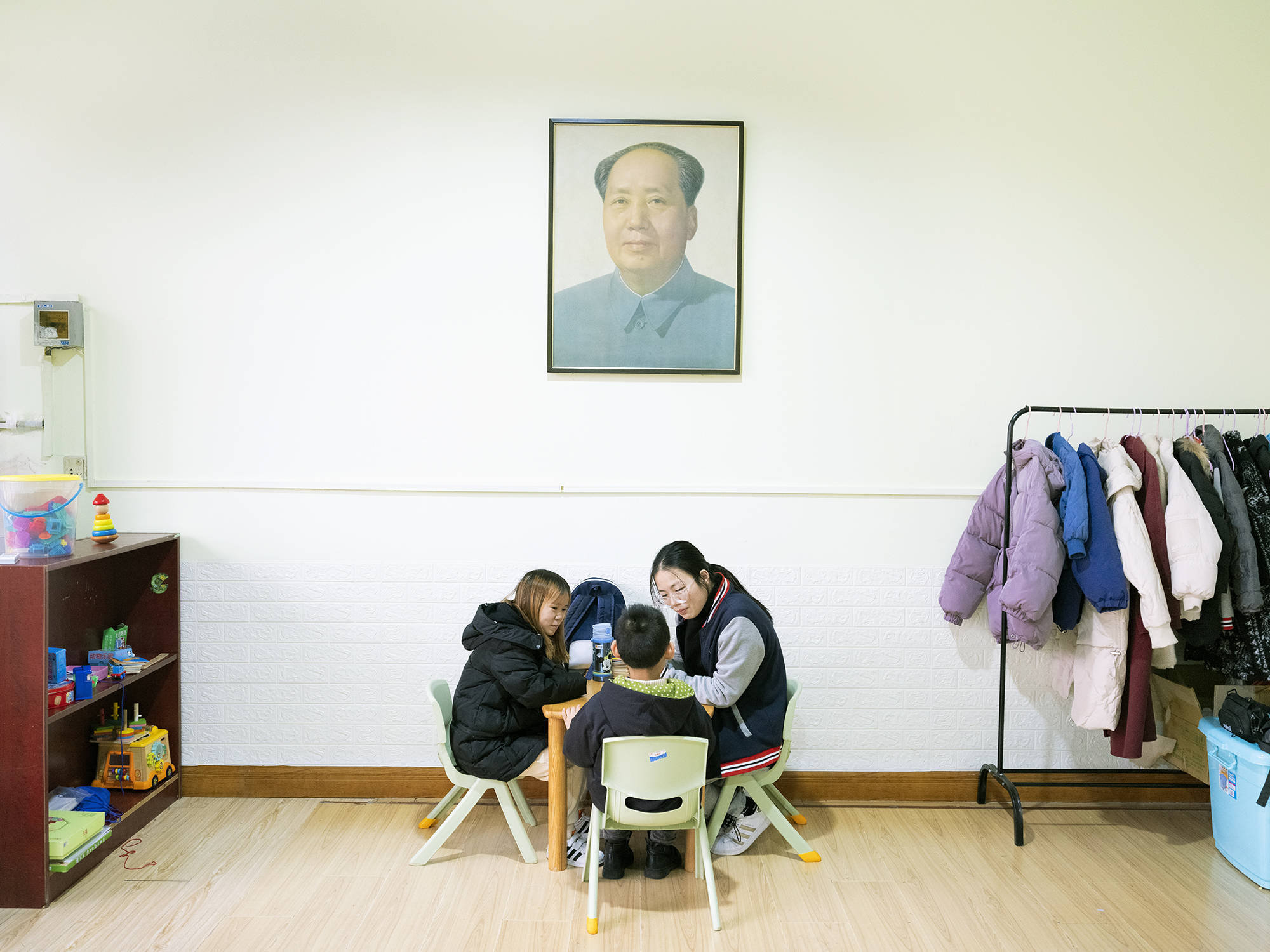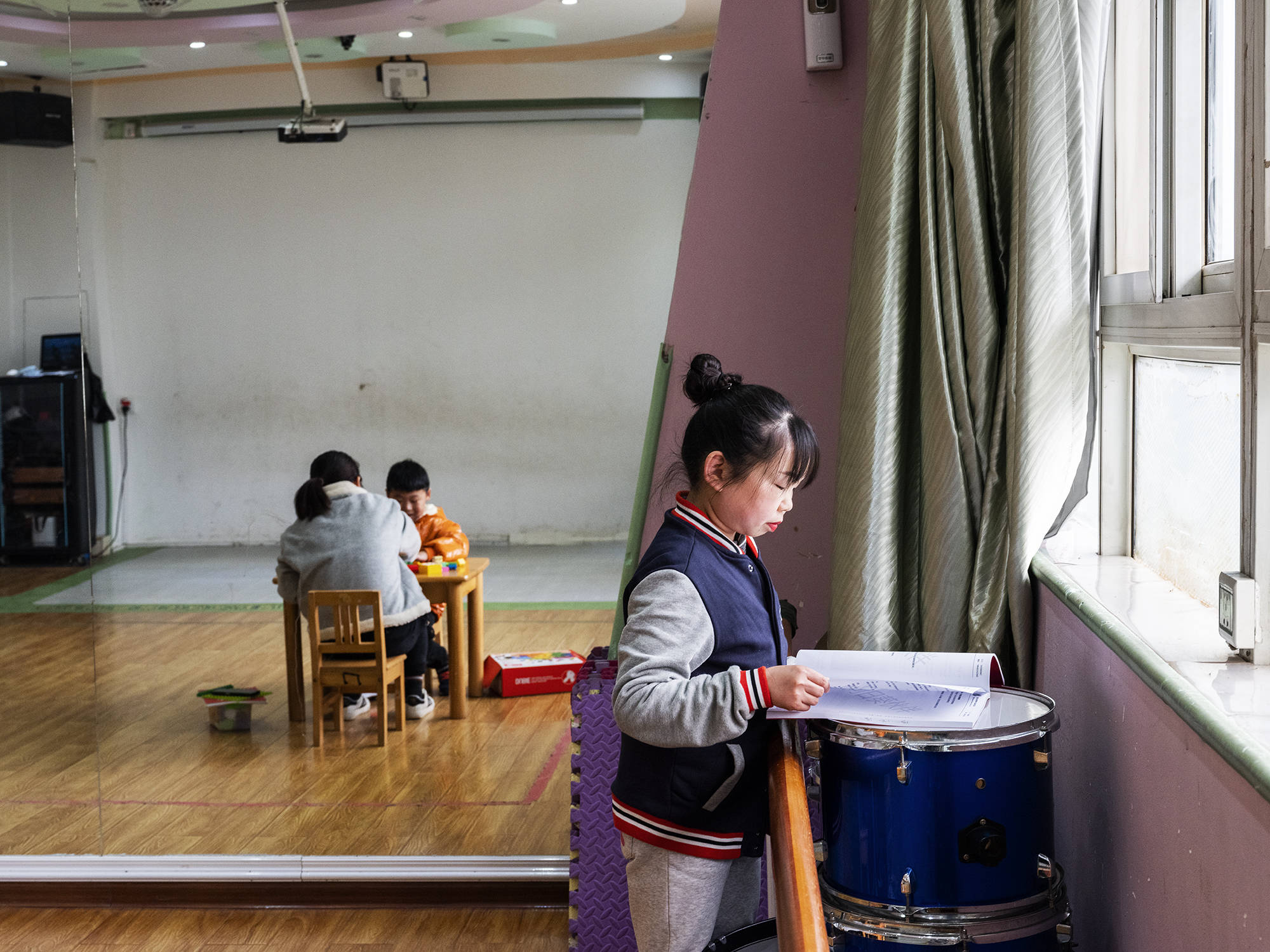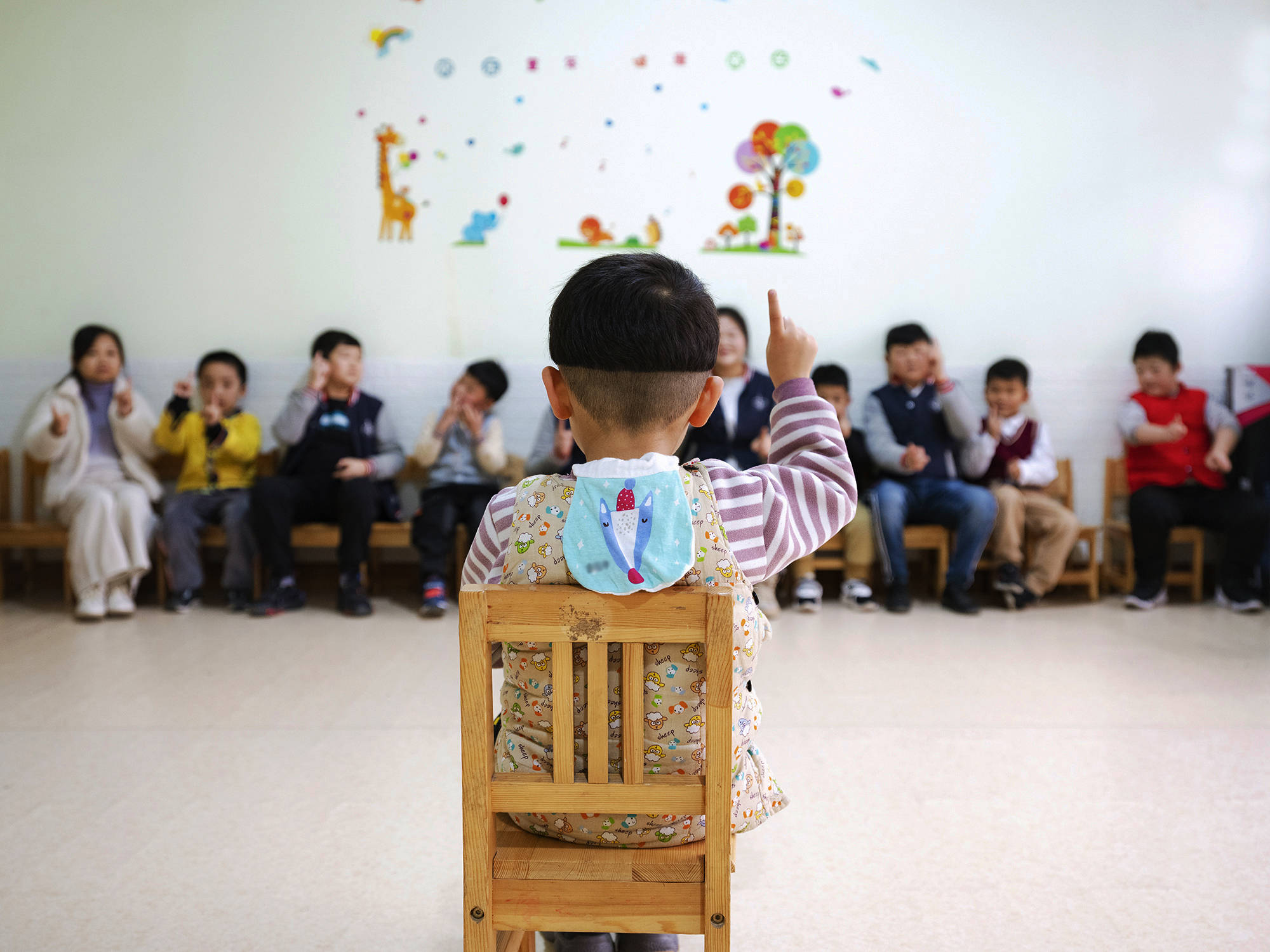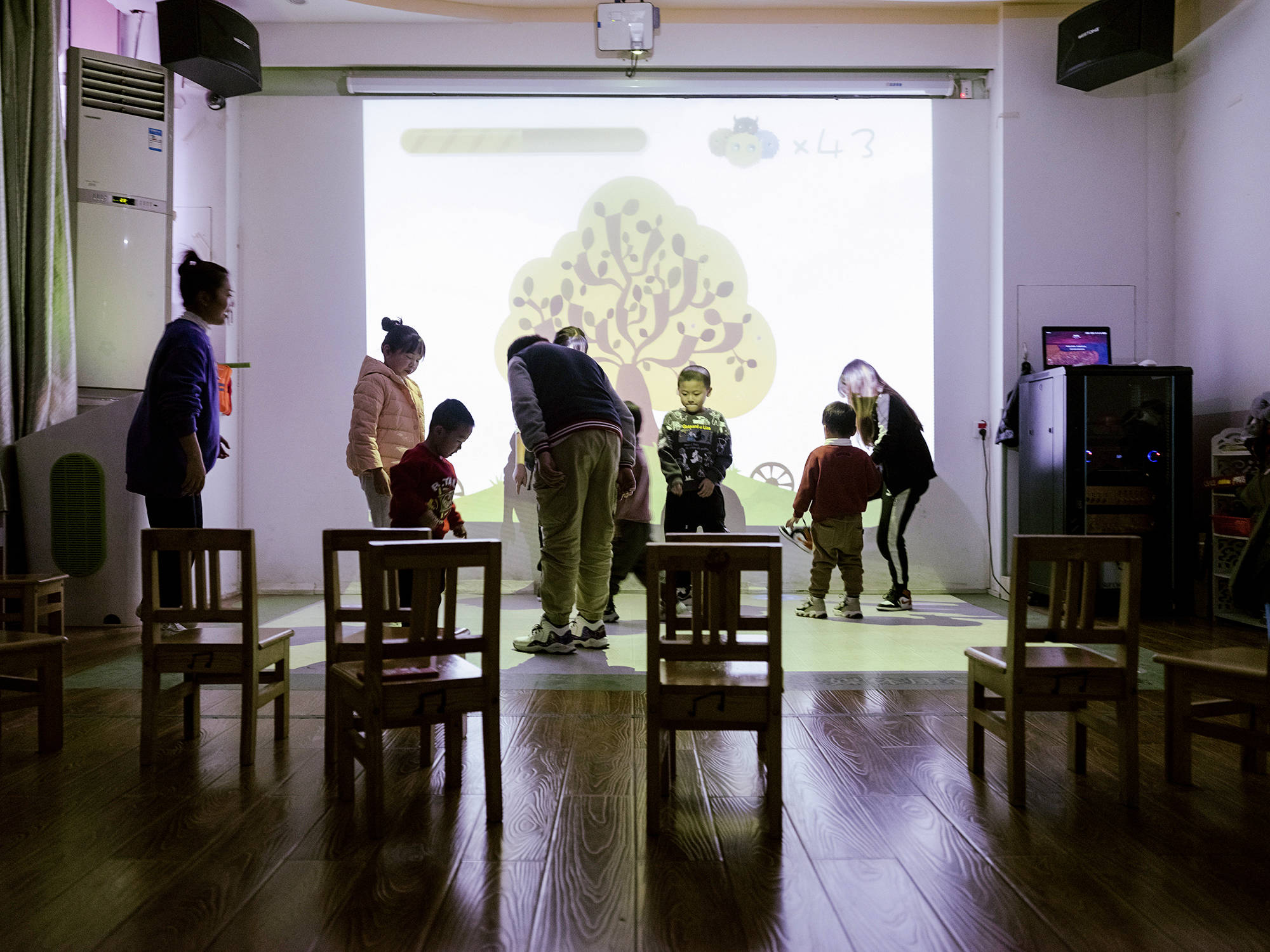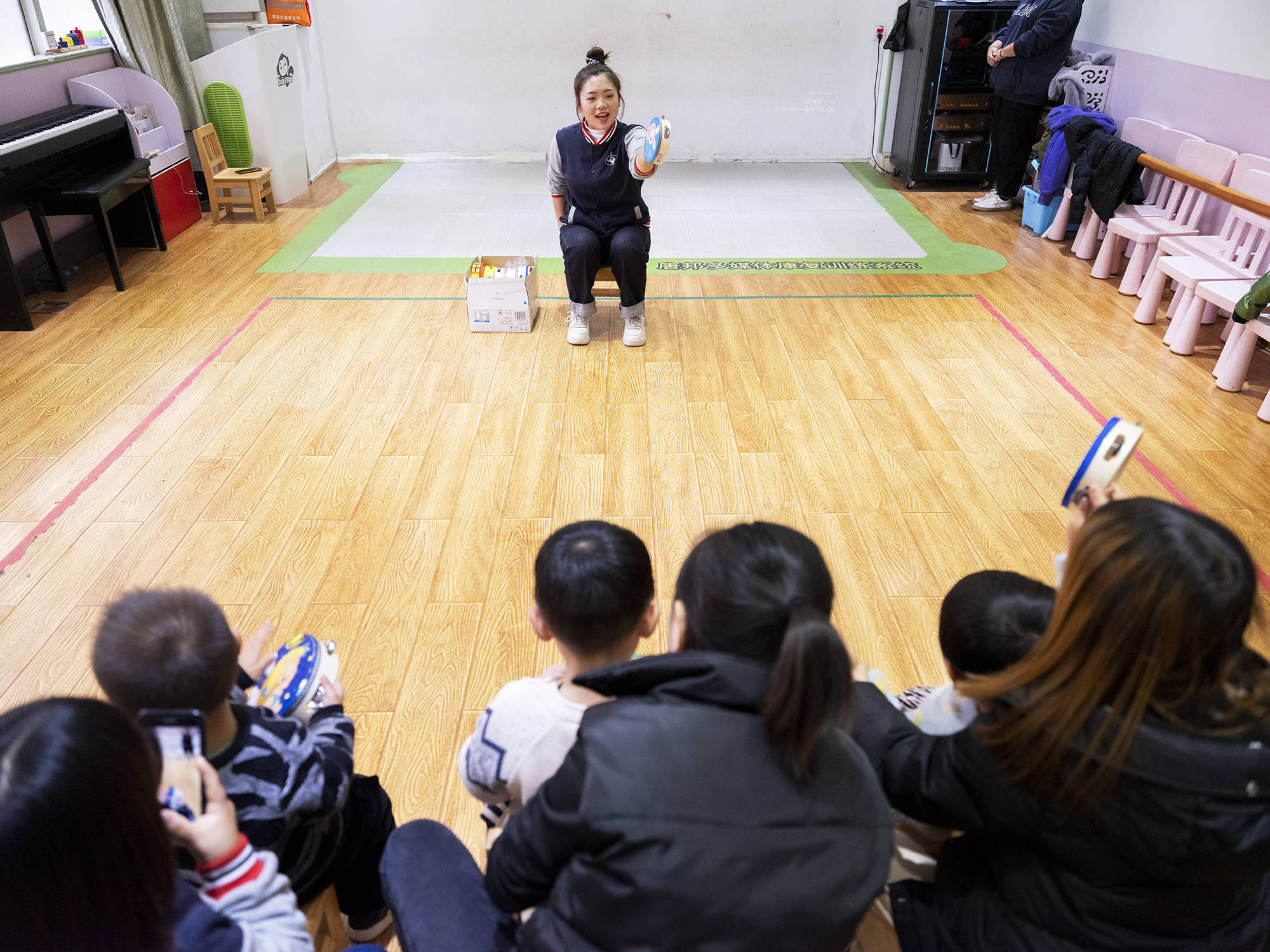 这堂音乐游戏课正要开始,年轻的女老师组织大家搬来板凳,8个“小朋友”坐成两排。实际上,只有前排的4个是学生,剩下的是“影子老师”。