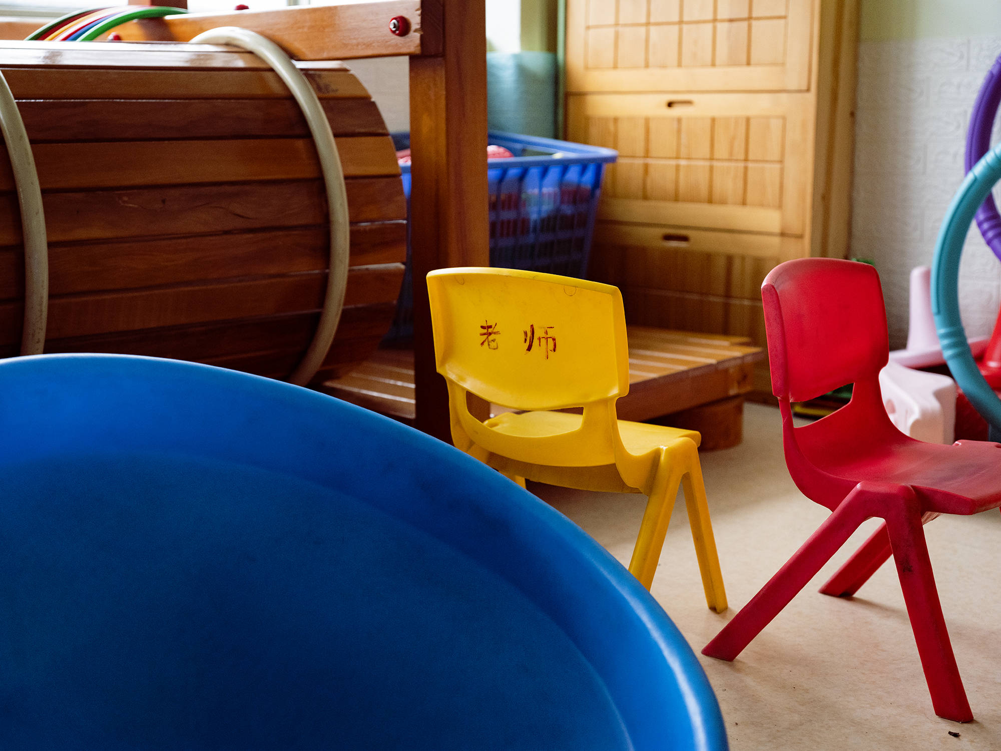 音乐游戏课之后是小组课,以集体游戏为主,穿插简单的问答。还有两位“影子老师”和娜娜一起上课。一位最为娇小,身高约一米一,两岁左右的孩子,经常分给她带。另一位则最为年长,今年39岁,与其他“影子老师”相比,脸上已经有些中年人的模样,但双手的皮肤还像孩子一样细腻。