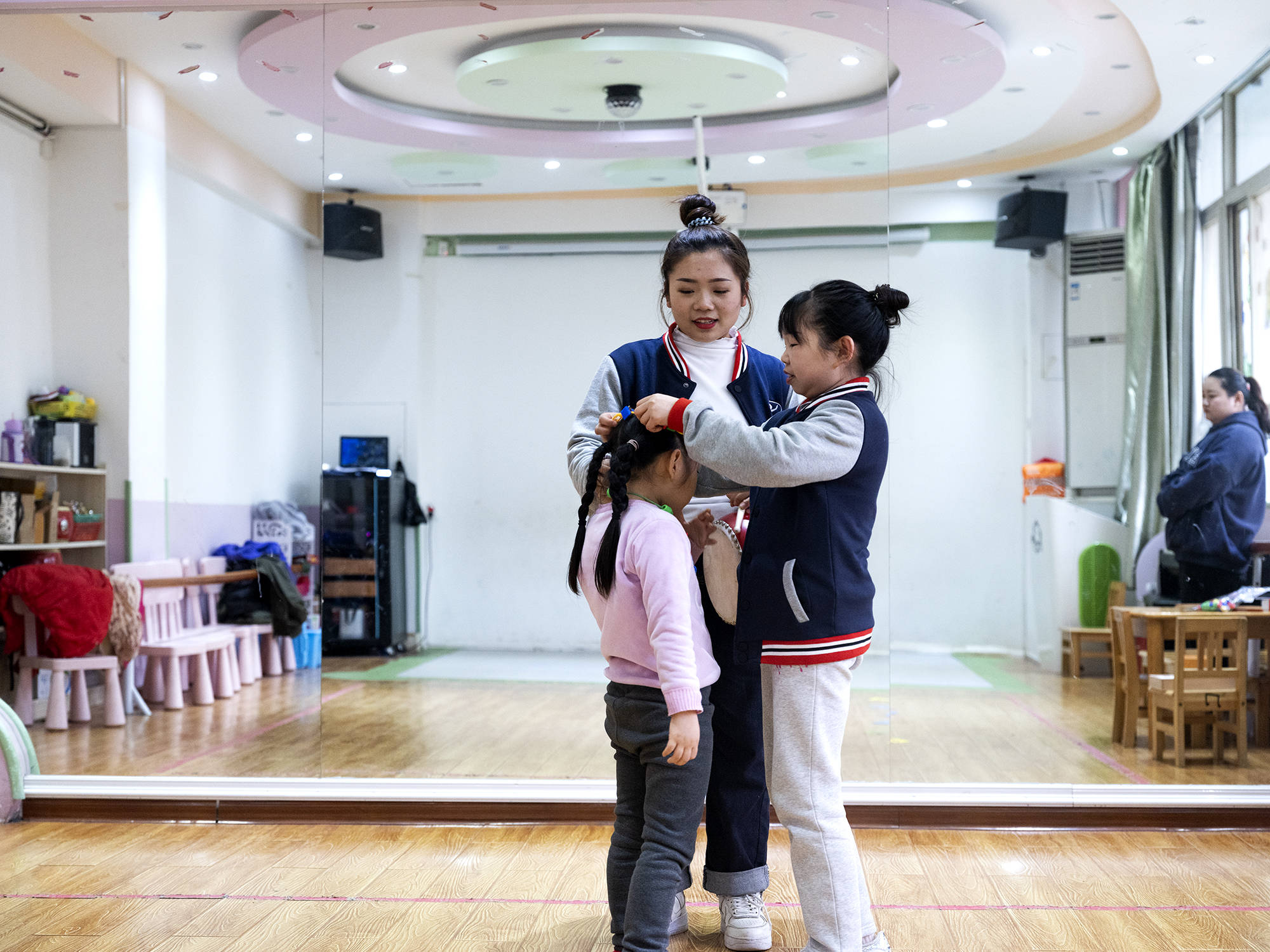 “影子老师”协助孩子们参与音乐游戏课程。