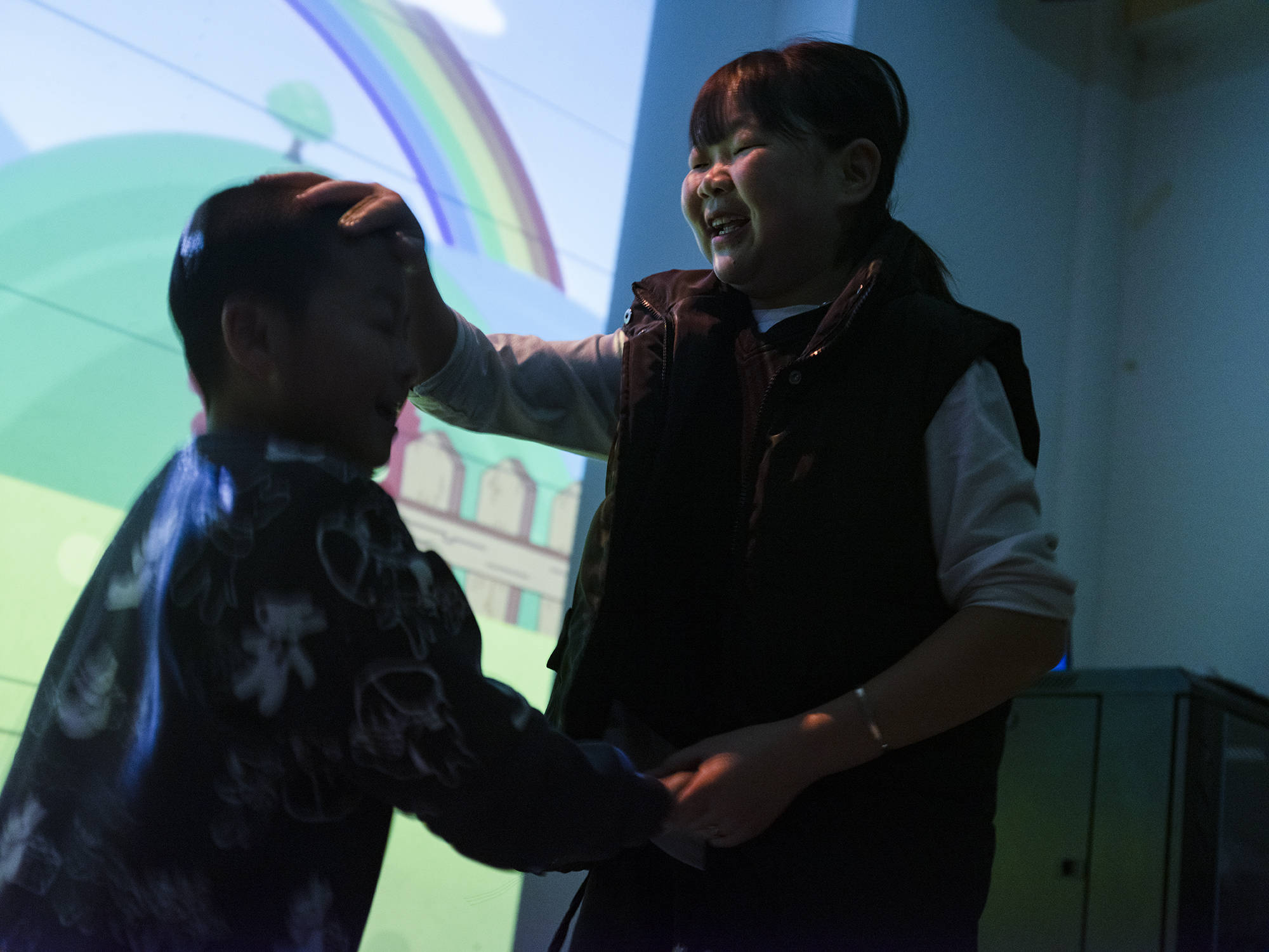 有时,男孩好像突然切换回了自己的世界。玩响鼓时,老师让大家敲击,他却自顾自地摇晃;大家在做体感游戏时,他会突然跑向投影的幕布,靠着放空。每到这时,娜娜需要提醒他,或者和主教老师,也是大家口中的“大老师”一唱一和,做出正确的示范。