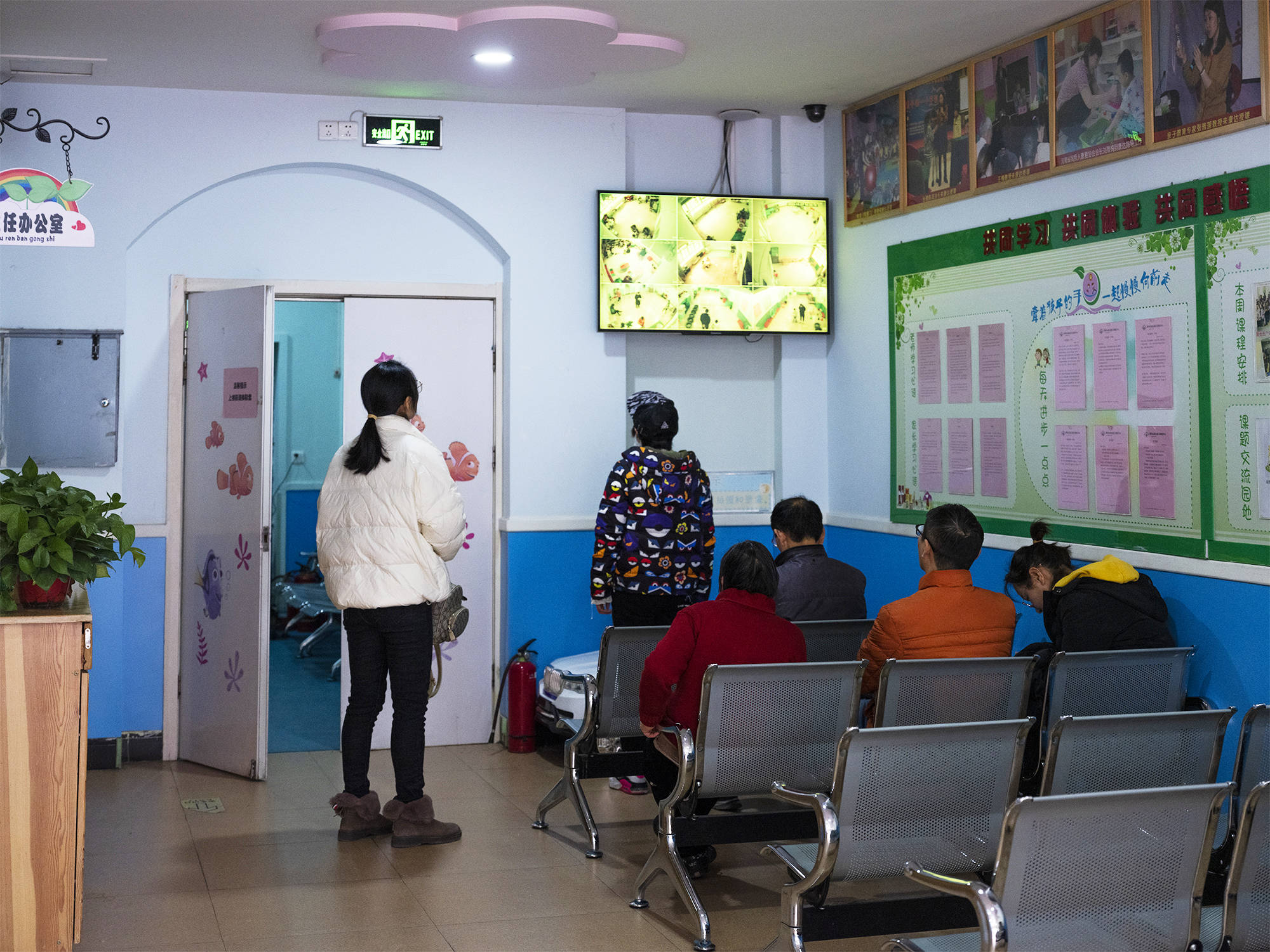 教室外,家长们紧盯监控屏幕,看孩子们上课。