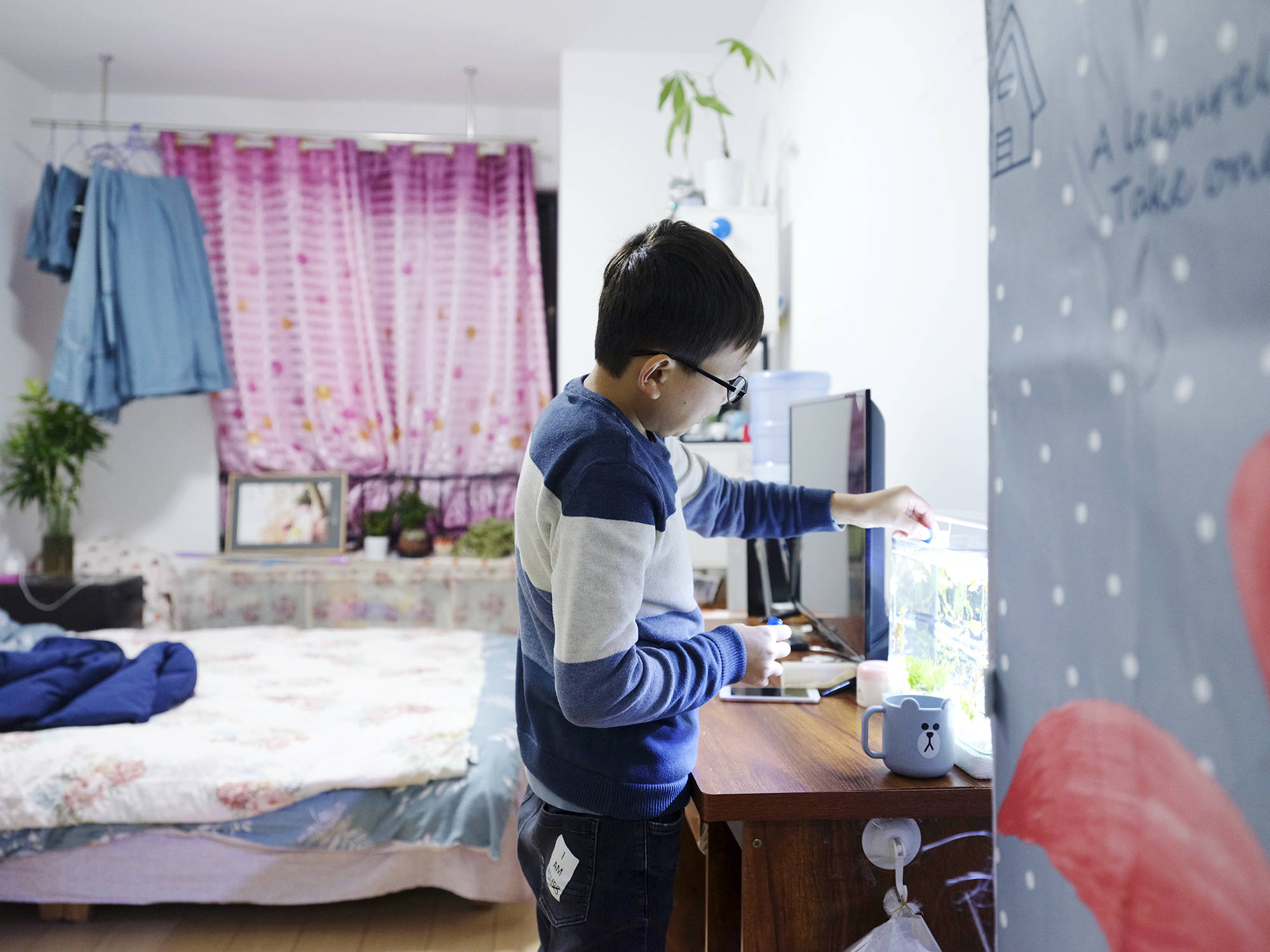 一天的课程结束,娜娜和丈夫小伟打扫完教室,骑着电动车回到出租屋。路程不远,5分钟就能骑到。小伟养了十几条孔雀鱼,回家后,来不及脱掉羽绒服,便跑到鱼缸前喂食。