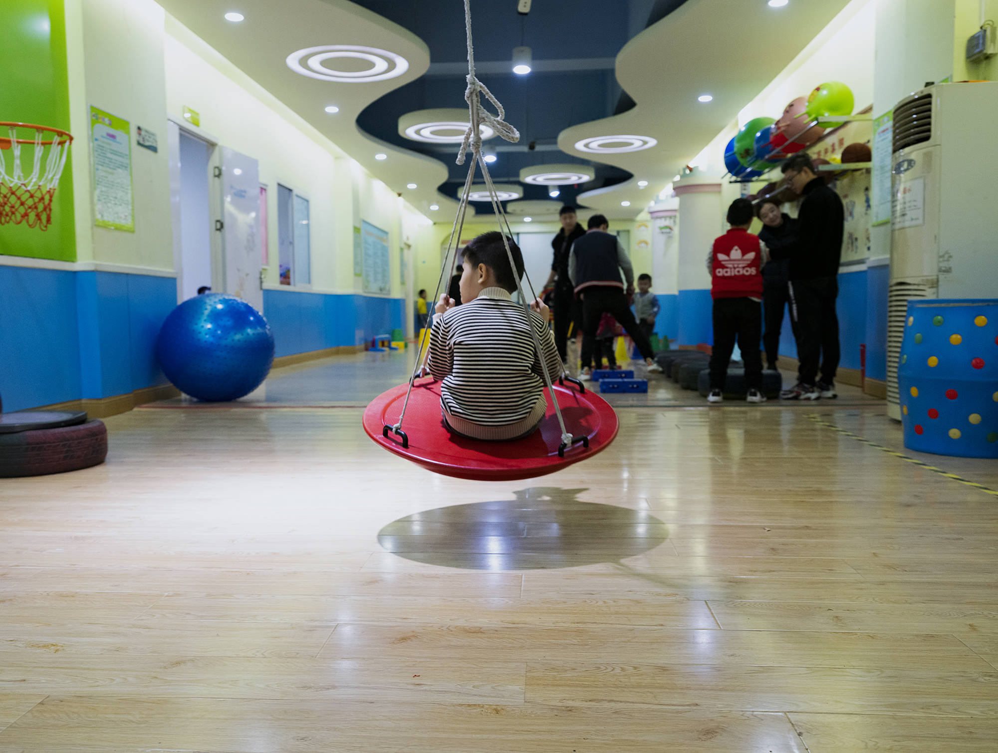 网红儿歌响起,教室的特制地板出现明显的震动,娜娜拉着几个孩子绕着教室转圈。打头的男孩穿着蓝色马甲,后面的孩子都在和娜娜对视、互动,他却神情恍惚,四处张望,不时吐几下舌头。娜娜一松手,他便不再前进,在原地挠着头。