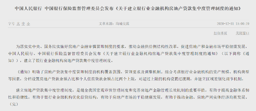 2020年12月31日,央行和银保监会发布了一则关于建立银行业金融机构房地产贷款集中度管理制度的通知。