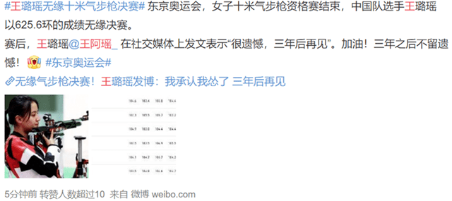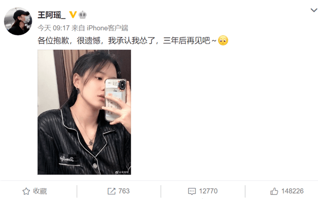 王璐瑶赛后发微博表示,“很抱歉,很遗憾,我承认我怂了,三年后再见吧”,还配上了一个难过的表情,和一张自拍。
