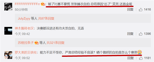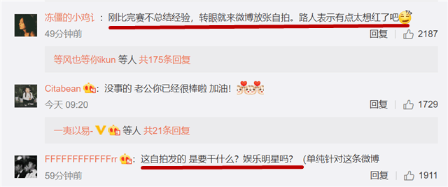 也许是失败了还发自拍的举动激怒了网友,这条微博下面的评论都是攻击王璐瑶的。有人表示:你心也太大了,三年后国家队还有你的位置吗?运动员要拿实力说话,发自拍干什么?也有许多路人表示,是不是太想红,打完比赛不总结经验,立刻来微博晒自拍,观感很不好。