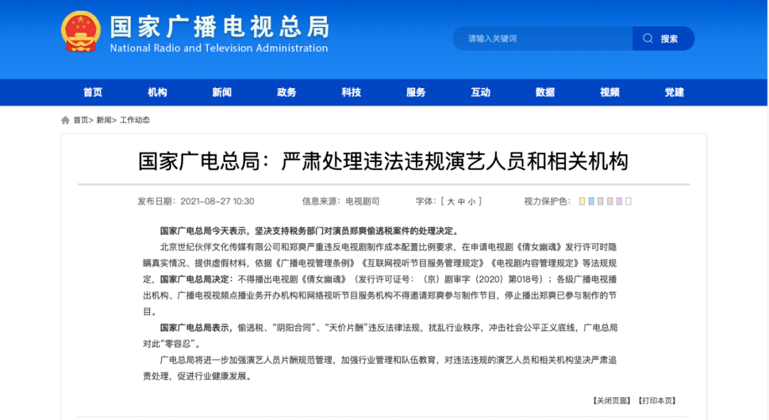 国家广电总局8月27日表示,坚决支持税务部门对演员郑爽偷逃税案件的处理决定。