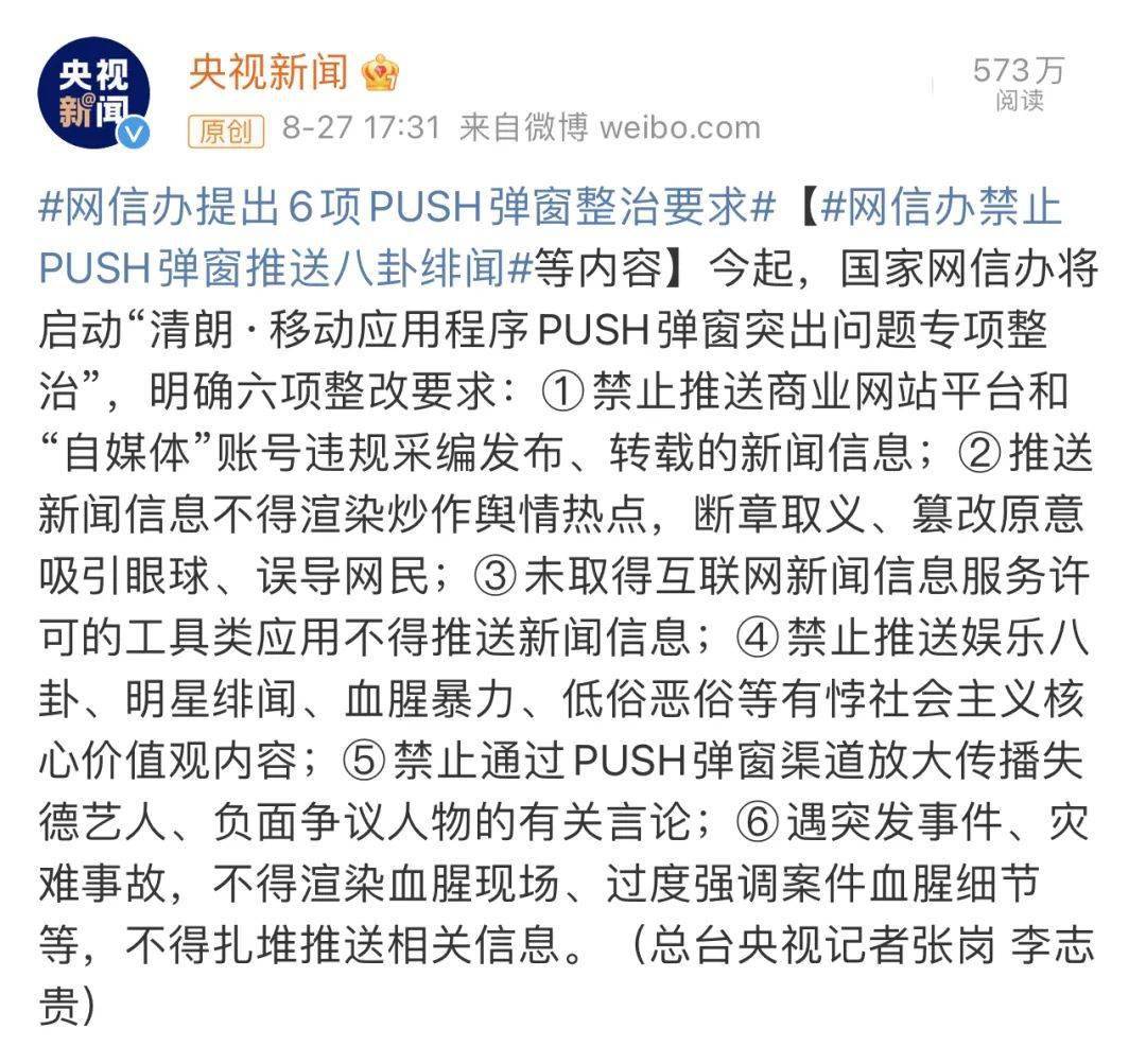 8月27日,中央网信办启动“清朗·移动应用程序PUSH弹窗突出问题专项整治”,聚焦突出问题靶向施策,推动PUSH弹窗传播秩序短期内实现明显好转。