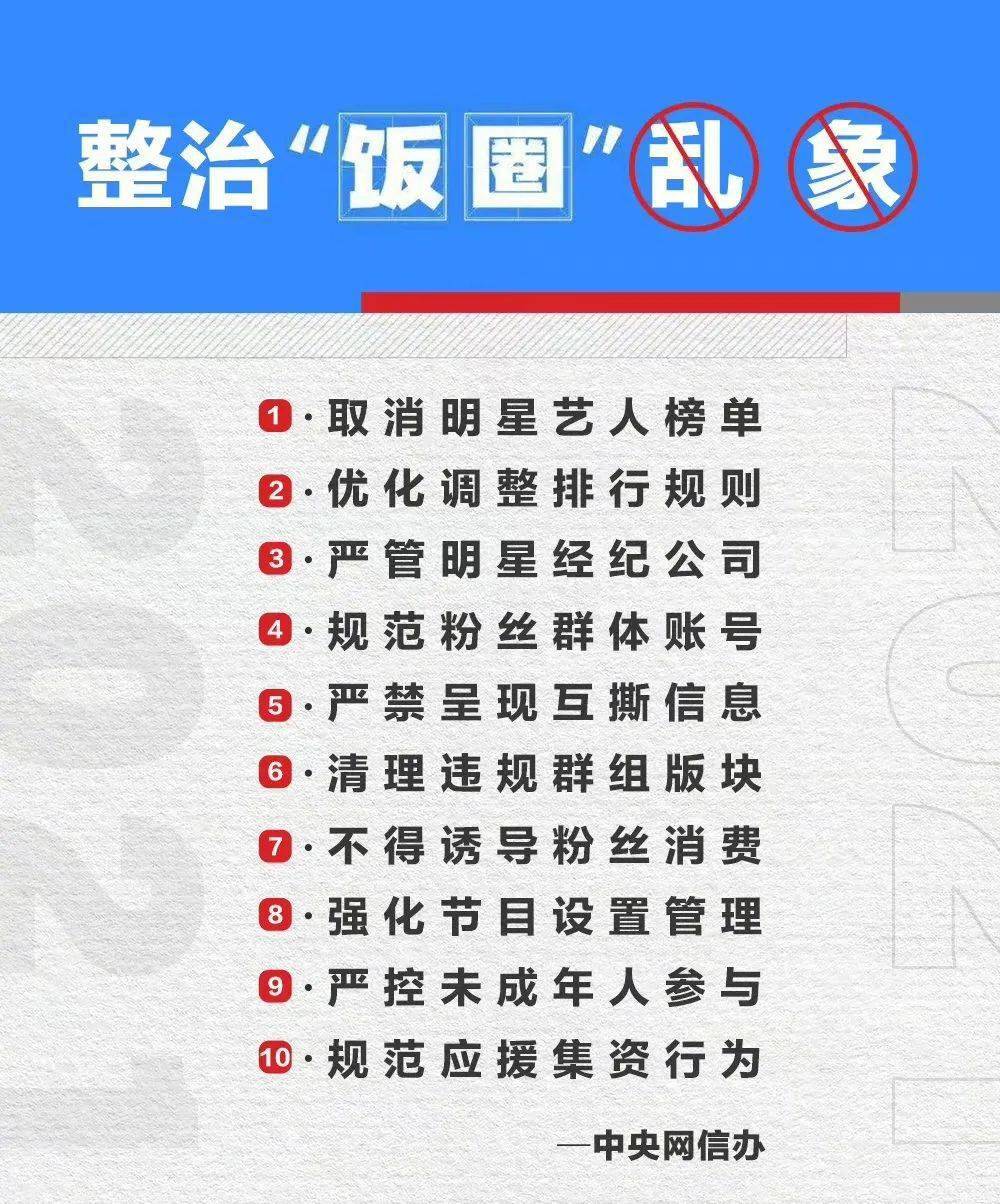 中央网信办近日发布关于进一步加强“饭圈”乱象治理的通知,为进一步加大治理力度,压紧压实网站平台主体责任,切实突破重点难点问题,不断巩固和扩大专项行动成果,重拳出击解决“饭圈”乱象问题,提出取消明星艺人榜单、优化调整排行规则、严管明星经纪公司等十项措施。