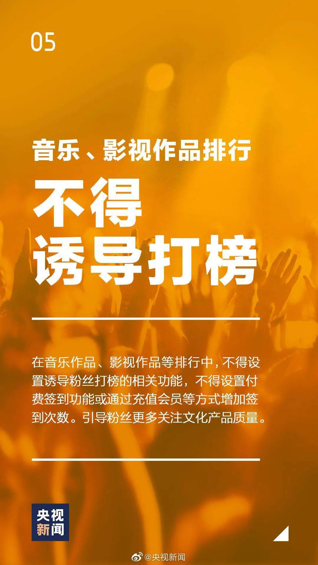 在音乐作品、影视作品等排行中,降低签到、点赞、评论等指标权重,增加作品导向及专业性评价等指标权重。不得设置诱导粉丝打榜的相关功能,不得设置付费签到功能或通过充值会员等方式增加签到次数,引导粉丝更多关注文化产品质量,降低追星热度。