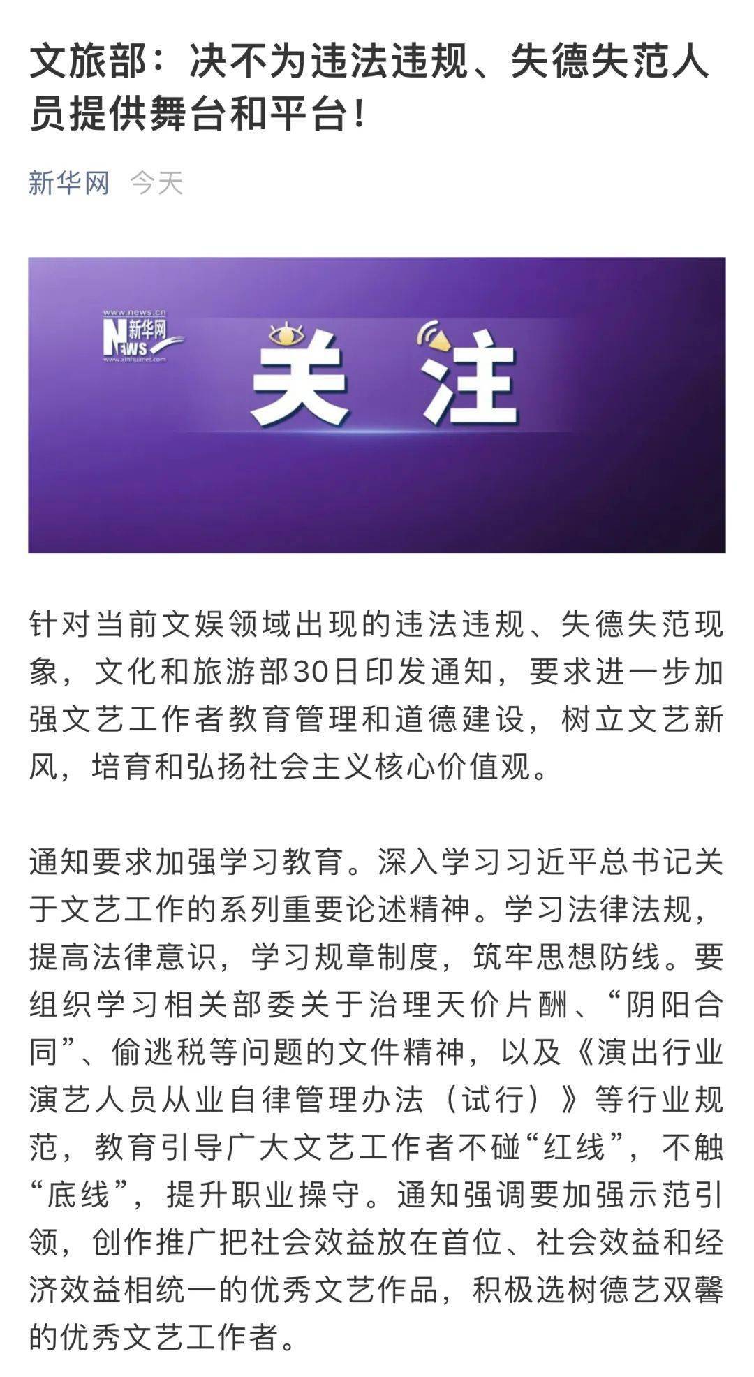 针对当前文娱领域出现的违法违规、失德失范现象,文化和旅游部30日印发通知,要求进一步加强文艺工作者教育管理和道德建设,树立文艺新风,培育和弘扬社会主义核心价值观。