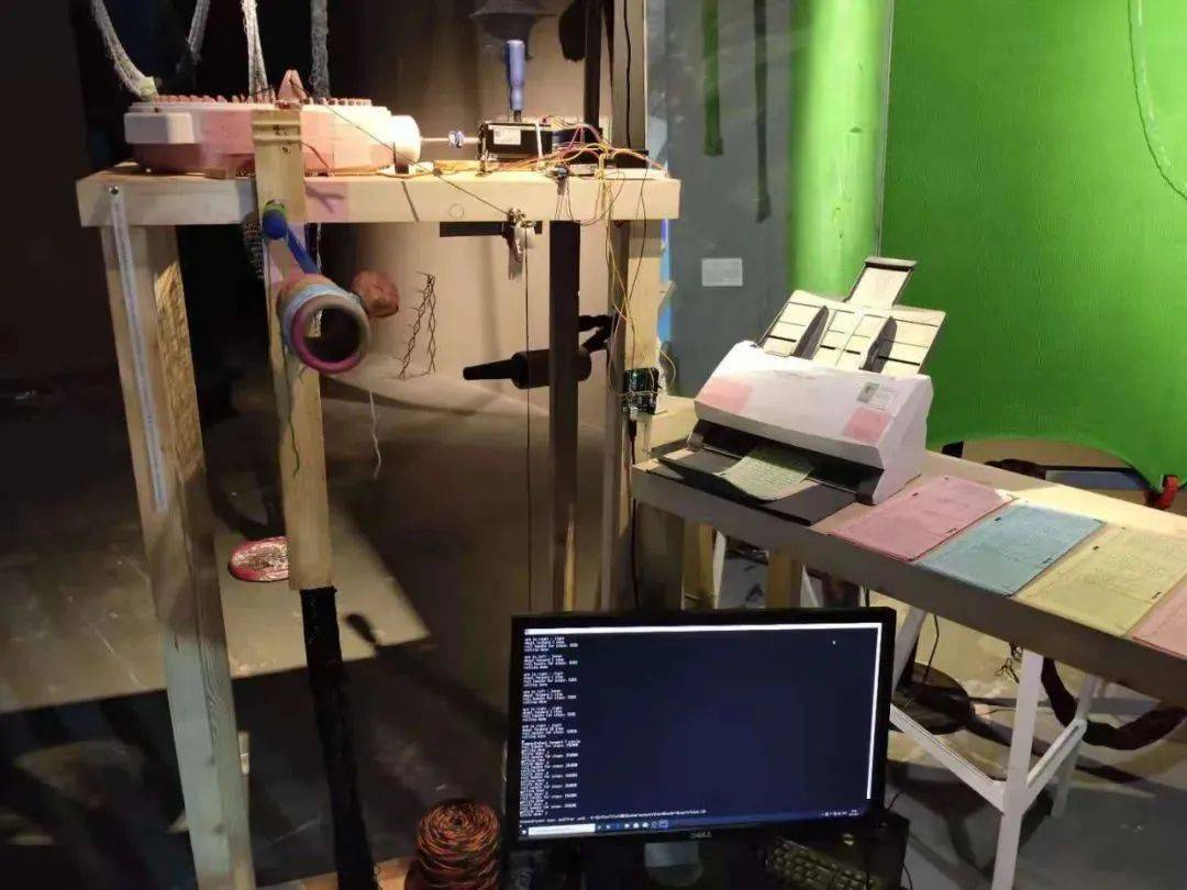 另一件新的作品来自 计算编委会小组(Weave By Committee)的“●text●tile/ 点_字_布”,这是基于性别田野、媒介研究和编织自动化技术的一个书写装置:由步进电机驱动的机械纺织圆盘随着数据输入生成基于不同赋值的往复运动,编结筒状的贴身织物,围罩成讨论场域:一份基于义乌和诸暨袜子工厂的调研形成的问卷,邀请观众在穿孔卡片上打孔回答问题作为数据输入,共同讨论包括编织与计算、智识生产的性别属性、编织产品与身体、编织工业中的基于性别的劳动等议题。