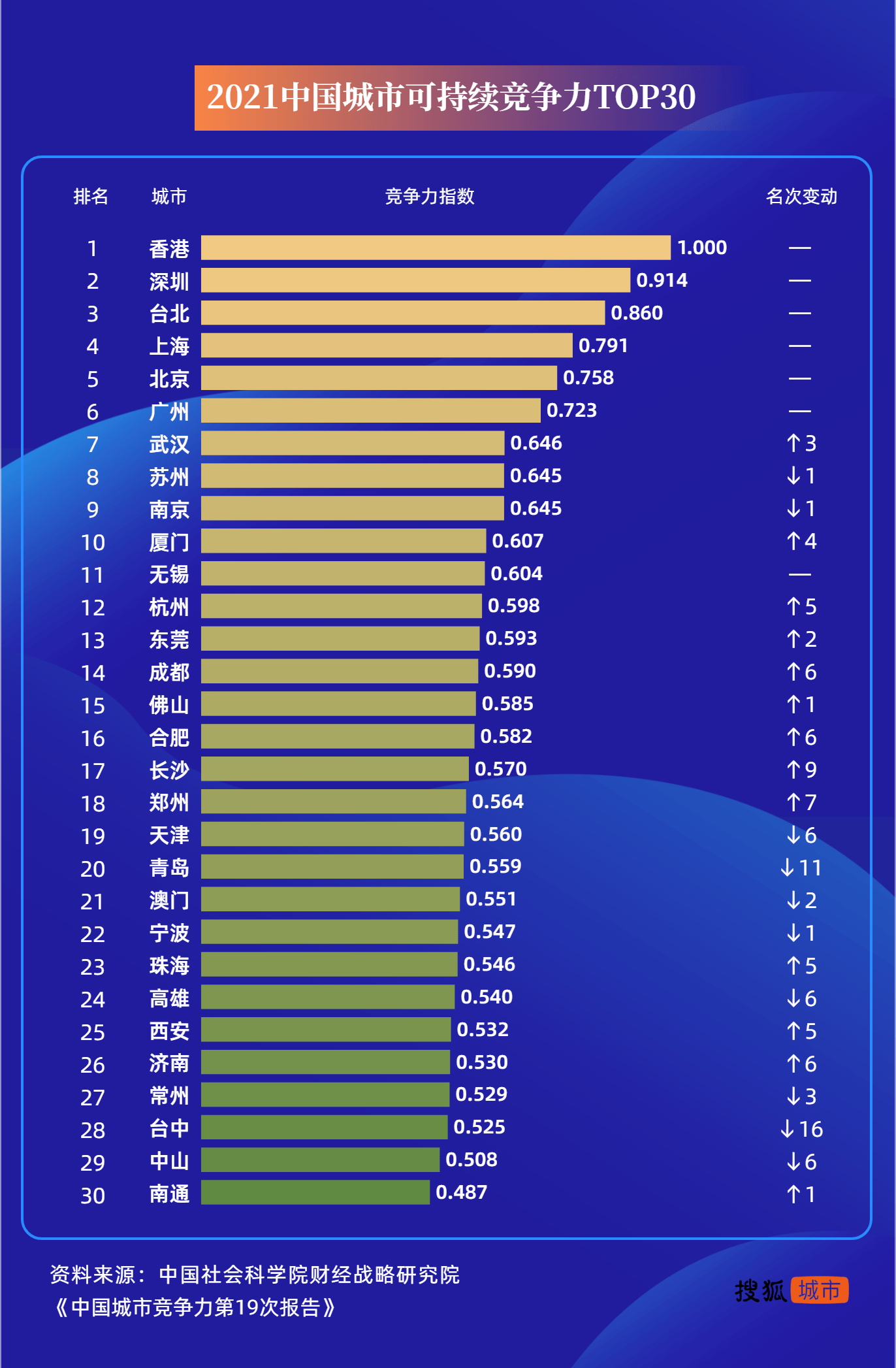 2021年综合经济竞争力排名前十城市依次为:上海、深圳、香港、北京、广州、苏州、台北、南京、武汉、无锡,头部城市格局稳定。