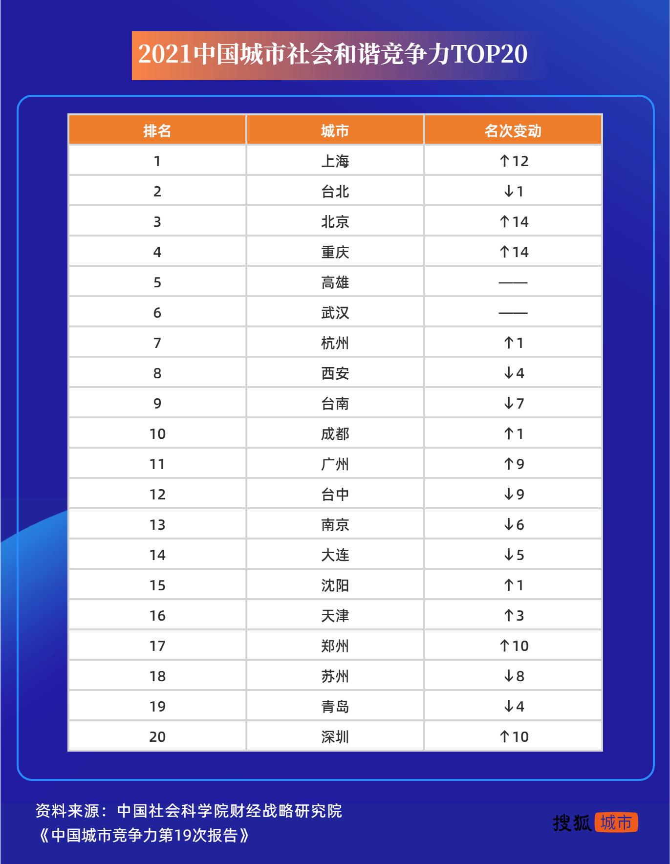 2021年中国社会和谐竞争力排名前十的城市依次为:上海、台北、北京、重庆、高雄、武汉、杭州、西安、台南、成都。第一名的上海较去年上升12名,第三名的北京和第四名的重庆同时提升14名。