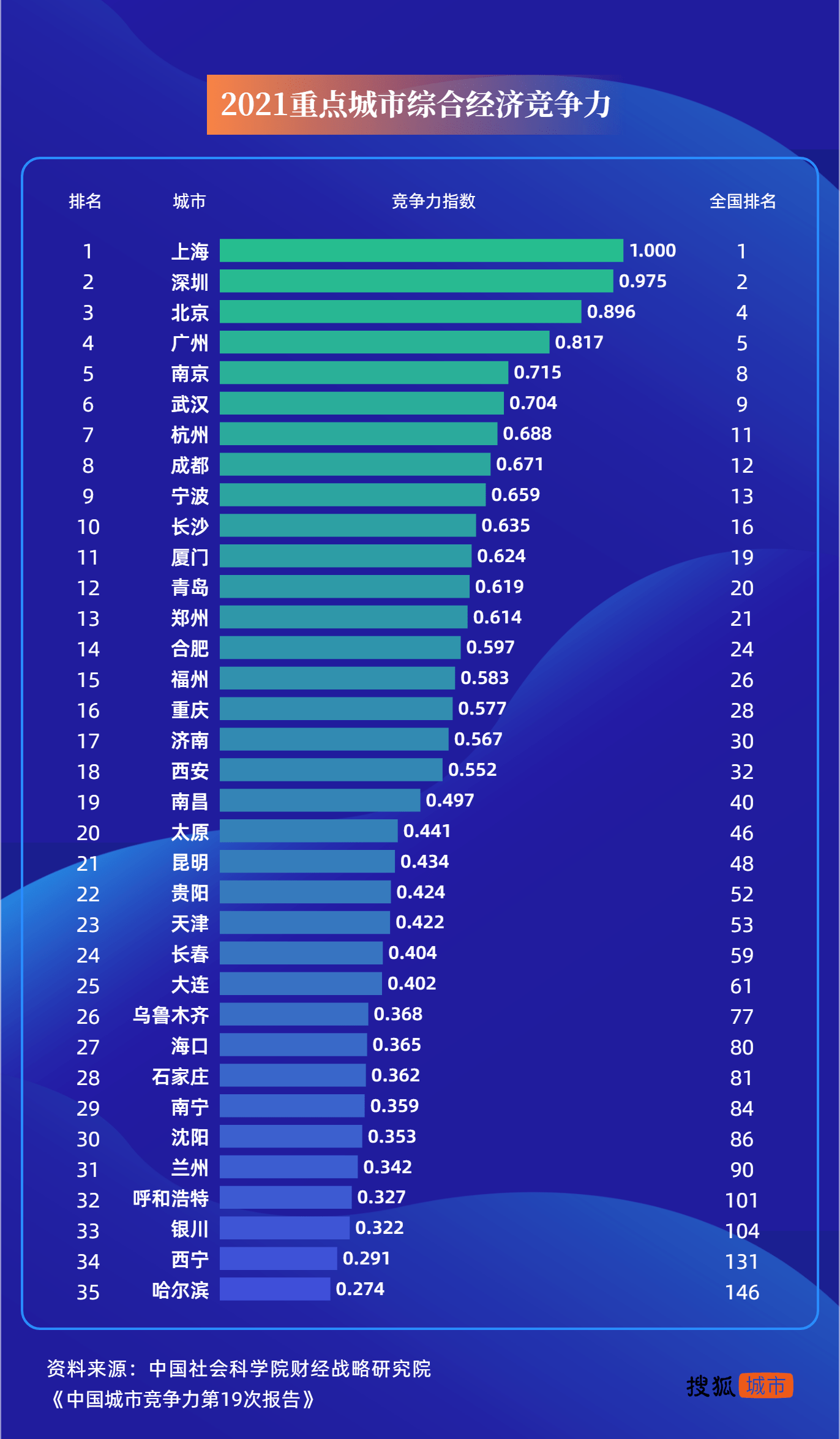 全国35个重点城市(直辖市、副省级城市、省会城市,数据不含拉萨,下同)内部分化明显。北上广深强一线格局依旧不变,黑龙江省会城市哈尔滨在重点城市中垫底。全国范围内,哈尔滨综合经济竞争力排名146位,比去年下降5位。