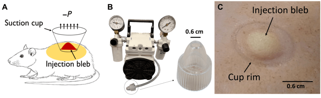 研究者将表达荧光蛋白的质粒注射到大鼠背部,并立刻以65kPa负压抽吸30s。这个压力并不过强,可以看到小鼠的皮肤只是略有拉伸 (好像小时候用吸管吸自己手的我)。