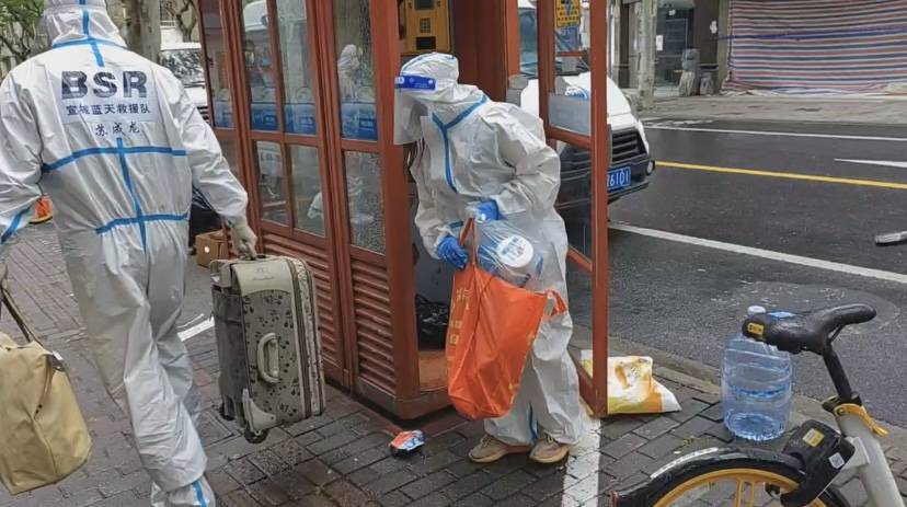 徐友勇负责宝山区的消杀工作,不便跨区行动,求助信息又转到宣城蓝天救援队的苏成龙,后者在上海负责物资运送且持有通行证,当天苏成龙带上了泡面和纯净水等物资,跨越三个区最终见到了电话亭里的袁玉萍。