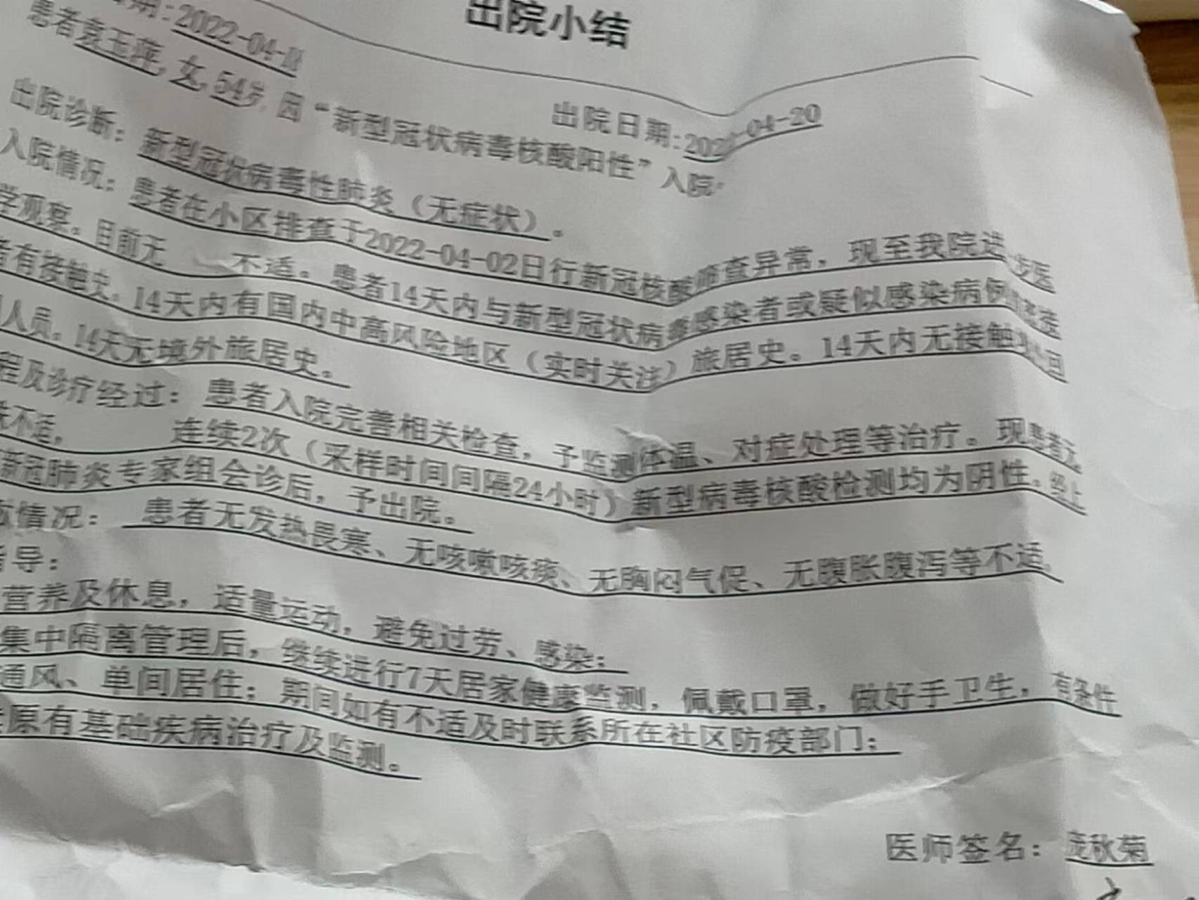 袁玉萍离开方舱时拿到的出院小结上,她曾被确诊为新冠肺炎无症状。 讲述者供图