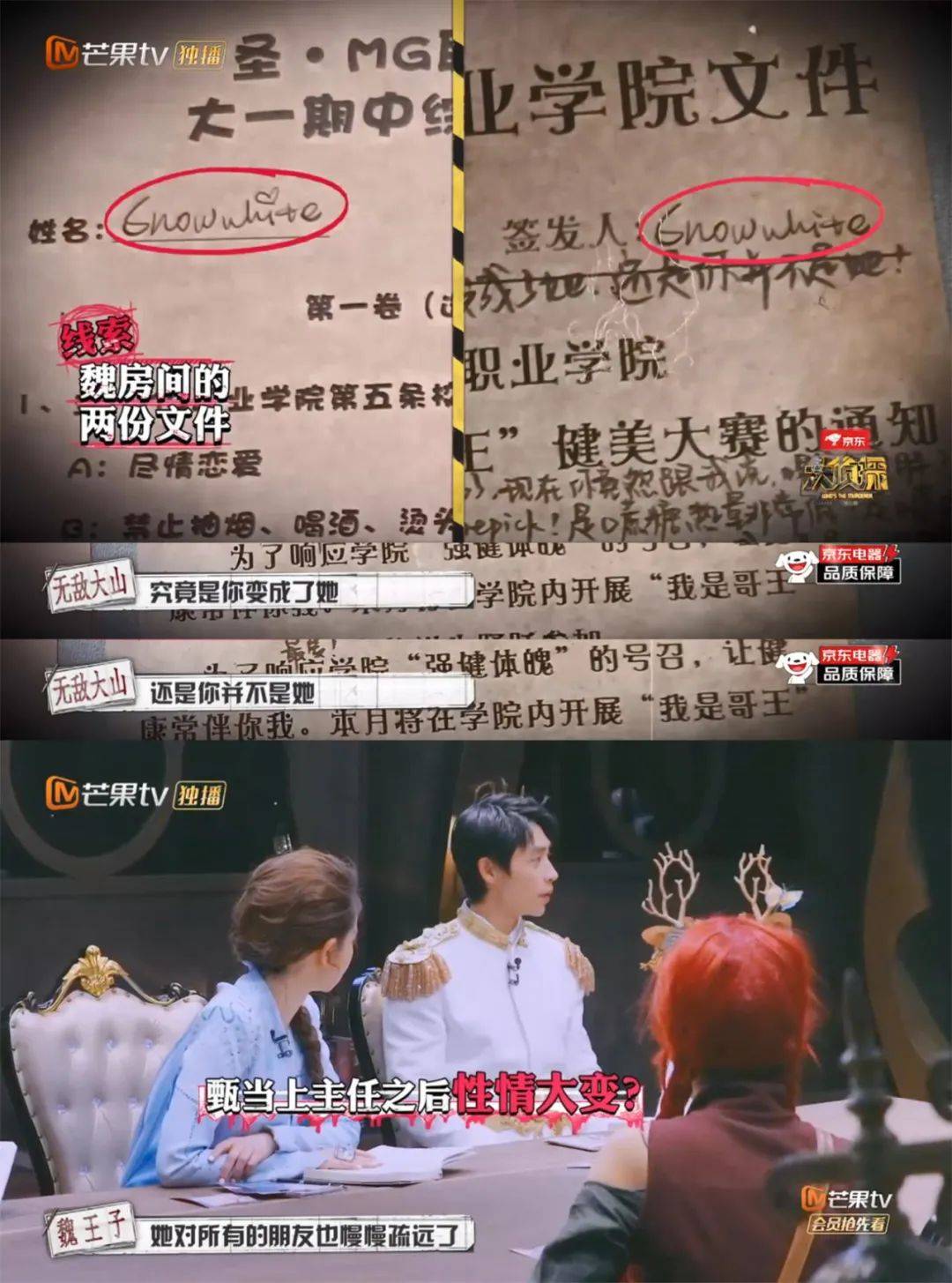 而且,嘉宾们刚刚入戏,吴彤就开始作为导演cue流程,还会真人入镜,时刻提醒观众这不是探案,只是个综艺。