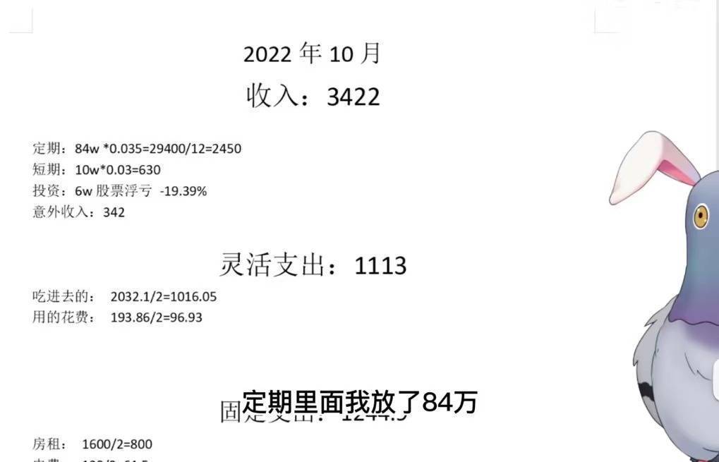 前不久我刚做完10月的收支复盘,收入方面,我定期放了84万,利率是3.5%,年收入有29,400元,平均每个月2450元,这是非常有保障的一项收入。上个月短期银行理财收益也有600多,算上做视频收入的几百块,总收入3400块。支出方面,我买了医保,不打算买社保,房租和吃用加起来大概2300多,也就是说还能盈余1000多块。