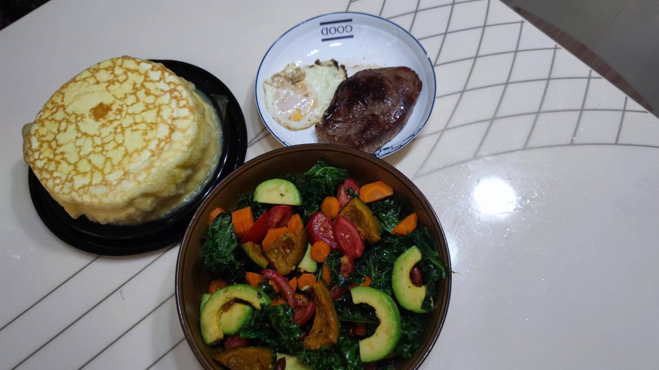 汪景中秋节的晚餐。超市88元的蛋糕可以吃好几天,自制羽衣甘蓝大拌菜成本不超过十块,网购的牛排99块钱5片。