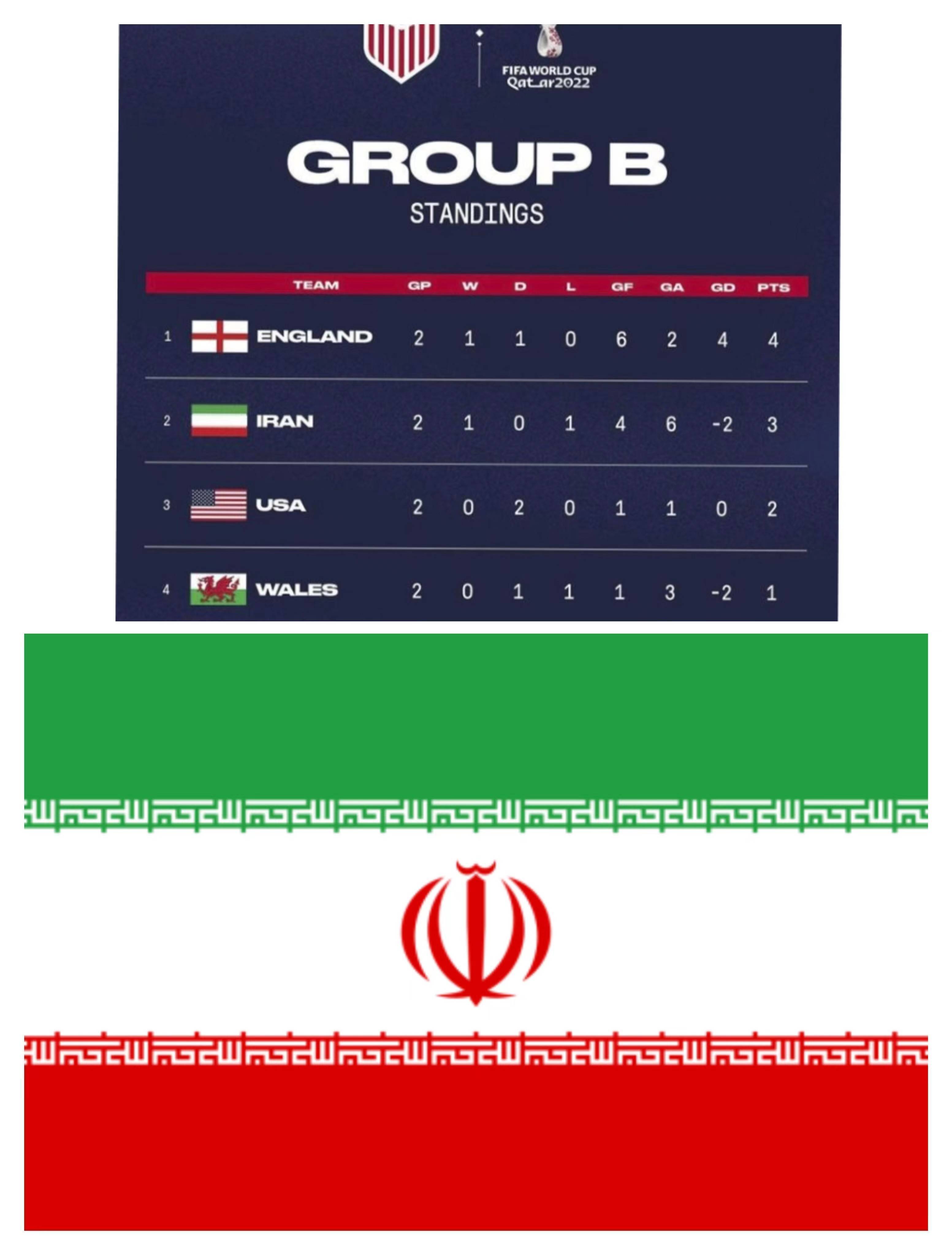 美国国家男子足球队(USMNT)的推特账户显示,在一张包含了英格兰、伊朗、美国和威尔士的积分与排名的B组小组赛积分榜上,伊朗国旗图只有绿、白、红三种颜色,没有白色中央的国徽标志。美国男足在脸书(Facebook)和IG(Instagram)的账户上也发布了同样的内容。