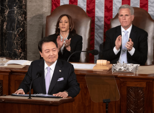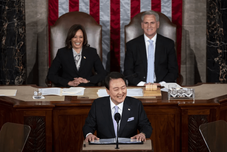 外国领导人在对美国进行正式国事访问期间,应邀在参众两院联席会议上发表讲话已成为一种传统。在拜登上任后曾有两位国家领导人在国会发表演讲——希腊总理米佐塔基斯和乌克兰总统泽连斯基,尹锡悦是第三位。
